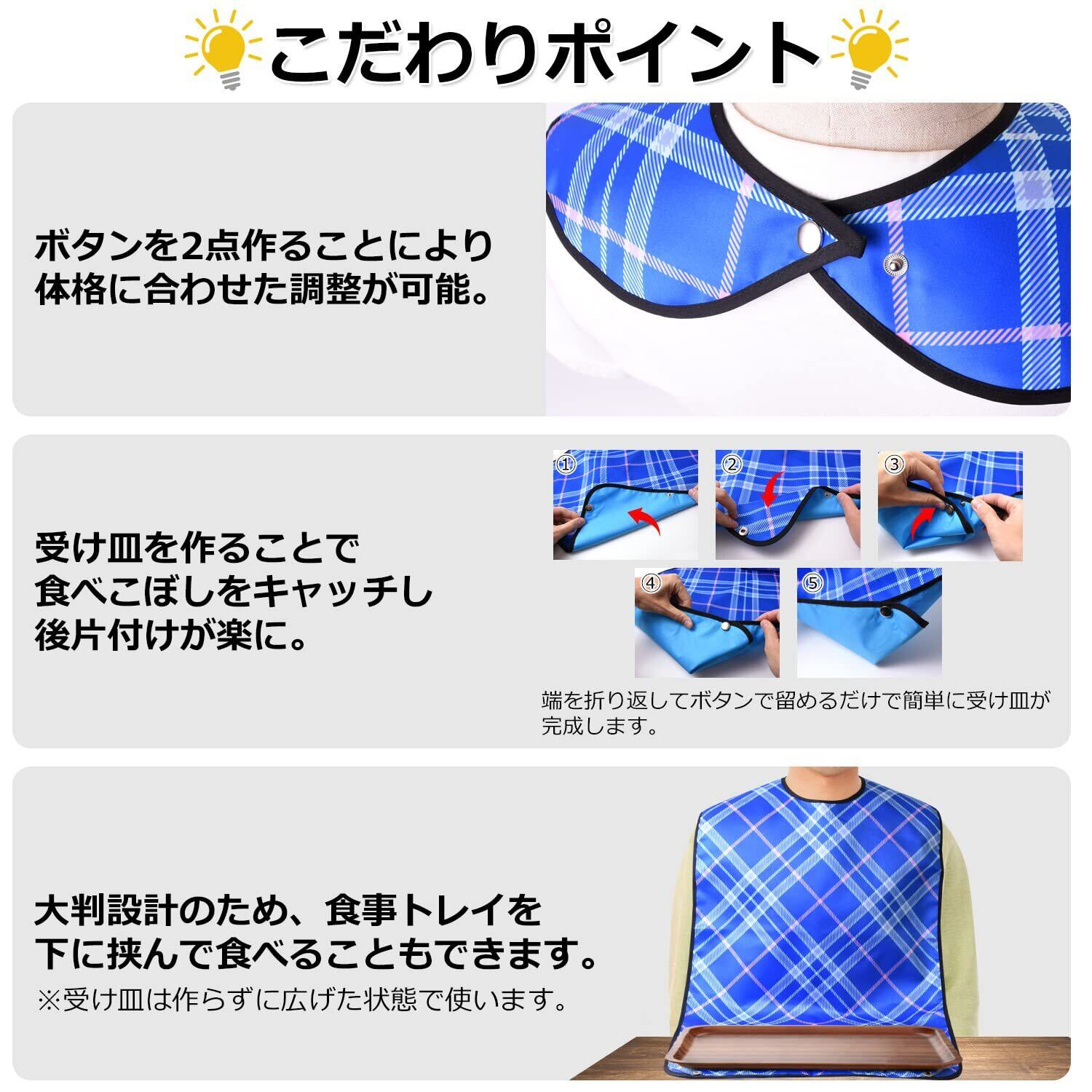 ・看護師監修による食事に特化したエプロン。大判設計のため食事トレイを下に挟んで食べることもできます。体格に合わせて調整できるよう首元のボタンを2点にしております。留め具はボタン式のためマジックテープ式に比べて粘着力の心配はございません。また、個を活かせるように7色のカラーから選んでいただけるようになっております。