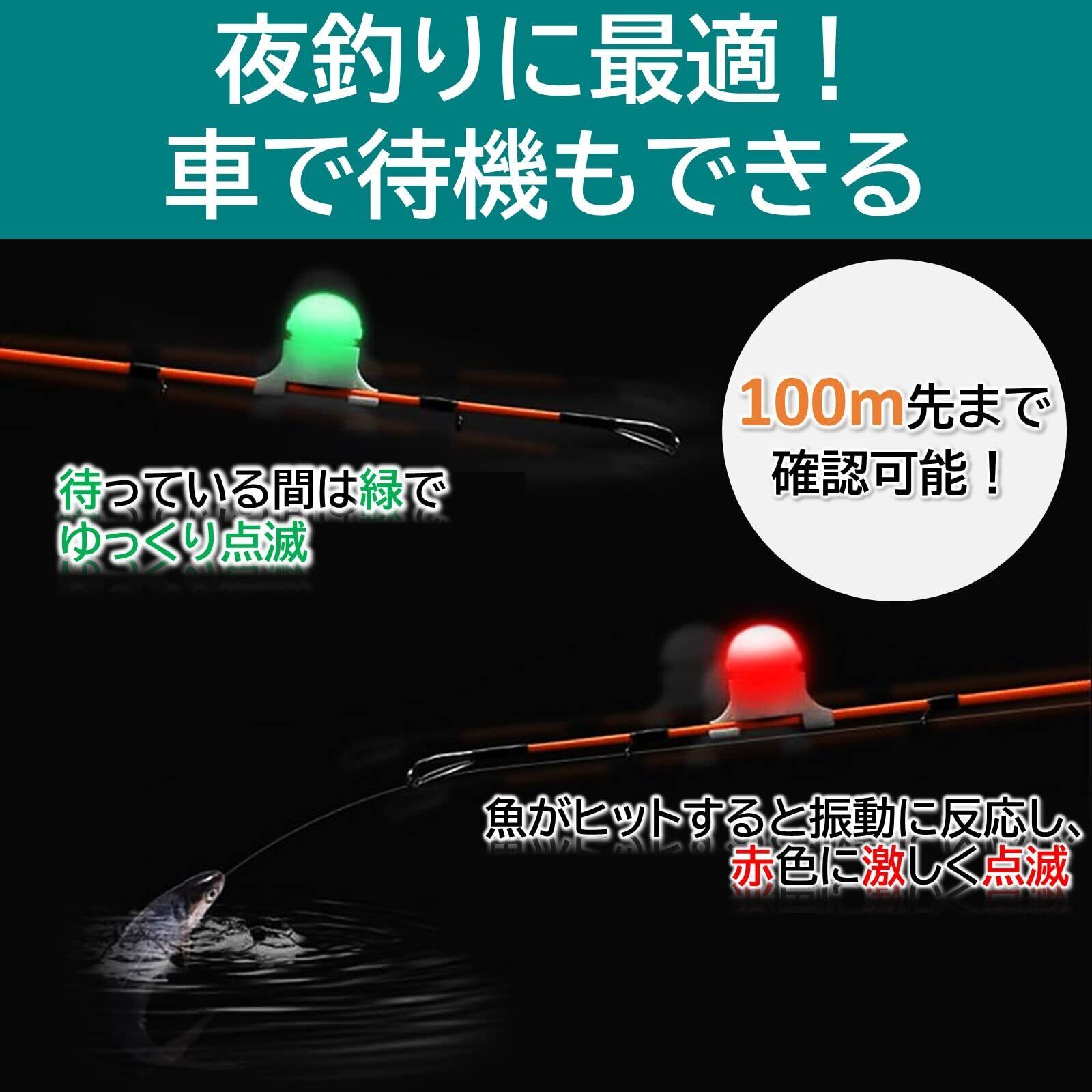 ロッドの先端にはめ込む、簡単設置。竿に取り付ければ自動的にスイッチが入り、取り外せば自動的にスイッチが切れます。省電力設計で最大300時間使用が可能です。