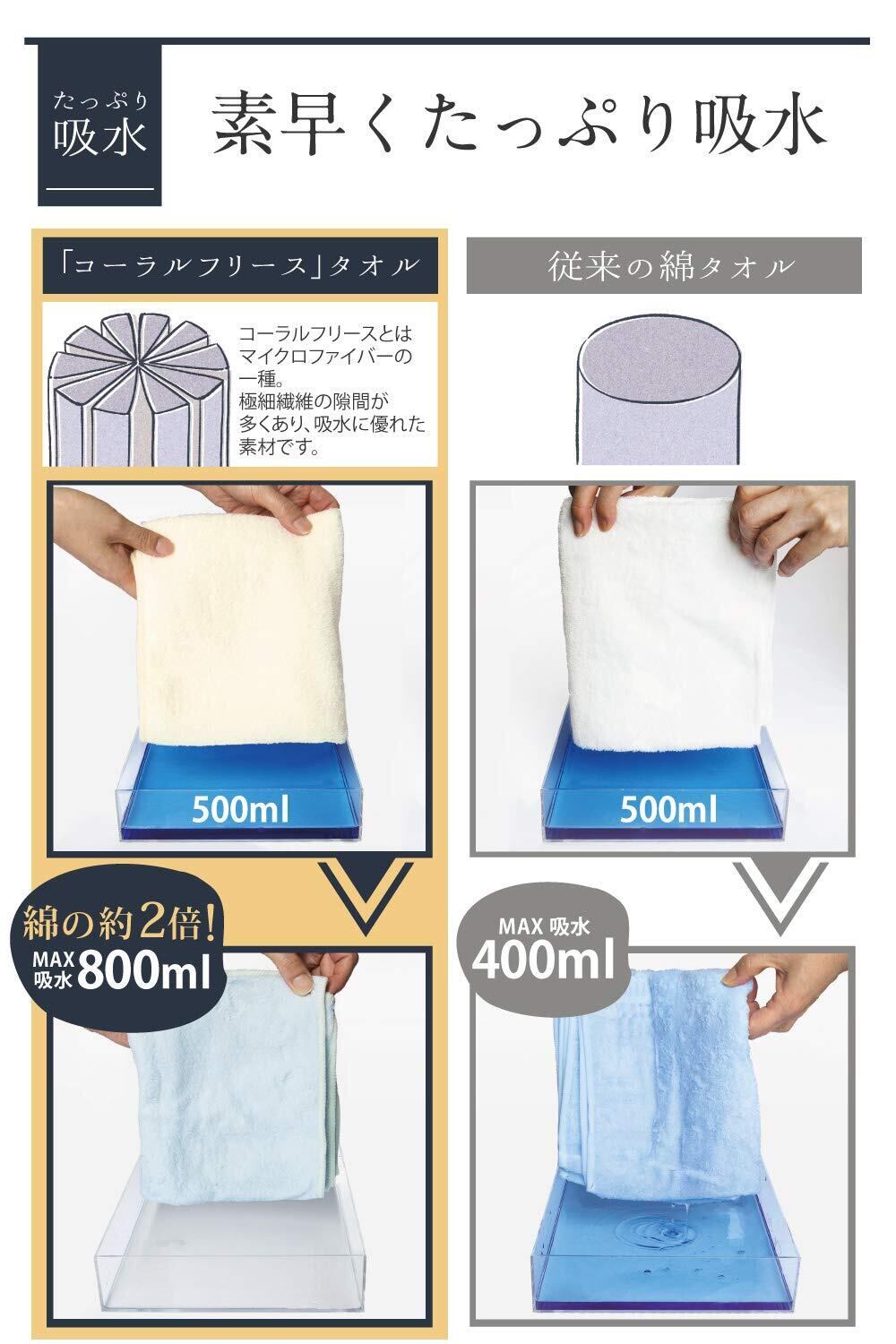 【抜群の吸水力・速乾性】綿繊維の約2倍!驚きの吸収力を実現。髪の毛より細い極細繊維に水分をたっぷりと含み、素早く拭き取ることができます。忙しい朝の洗顔や洗髪も手早く行えます。
