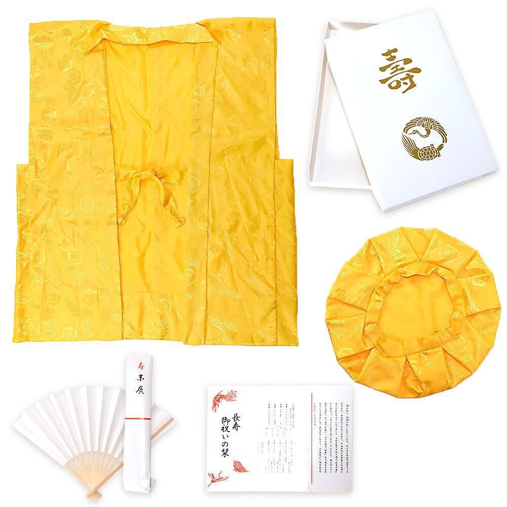 【サイズ】フリーサイズ 頭巾…直径約33cm/頭周り最大30cm(紐で調節可能) ちゃんちゃんこ…身丈:約71cm/身幅:約66cm 化粧箱…縦:約38cm/横:約25cm/高さ:約4cm(上蓋を閉じた状態) 末広…長さ:約27cm(閉じた状態)