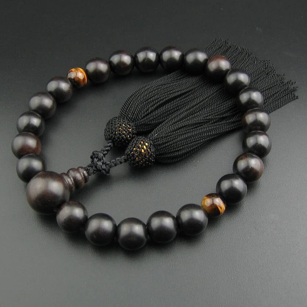 葬儀、お通夜、法事、お墓参りにて、すべての宗派のお客様にお使いいただける男性用の「略式数珠」でございます。素材は、人気な黒檀でございます。アクセントには、虎目石を使用させて頂きました。