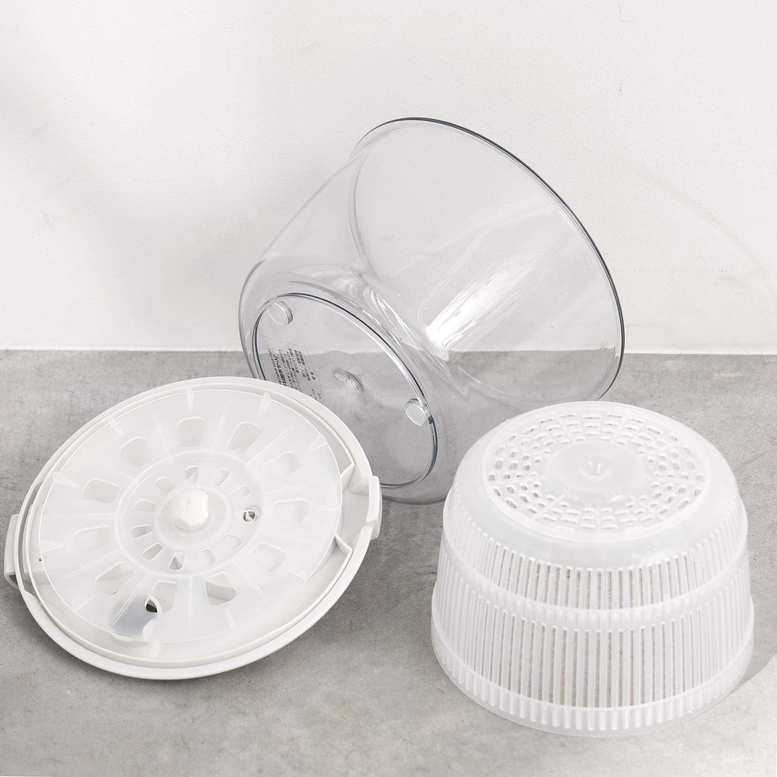 原料樹脂:容器/AS樹脂(耐熱温度70度)、ふたカバー・回転板・バスケット/ポリプロピレン(耐熱温度110度)