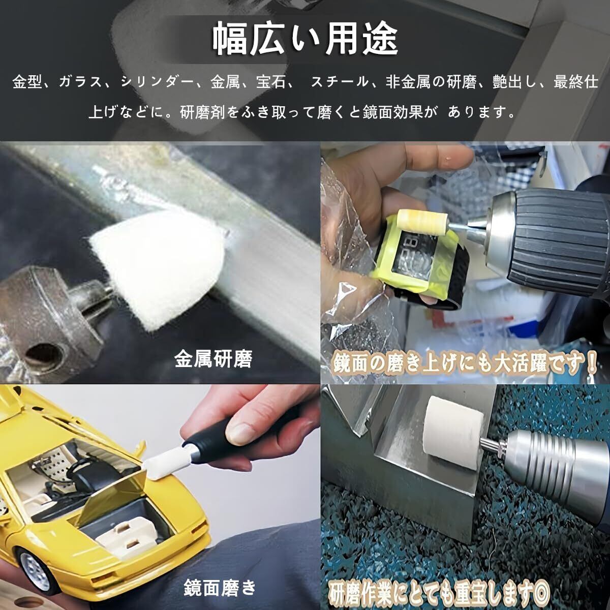 幅広い用途:金型、ガラス、シリンダー、金属、宝石、 スチール、非金属の研磨、艶出し、最終仕上げなどに。研磨剤をふき取って磨くと鏡面効果が あります。