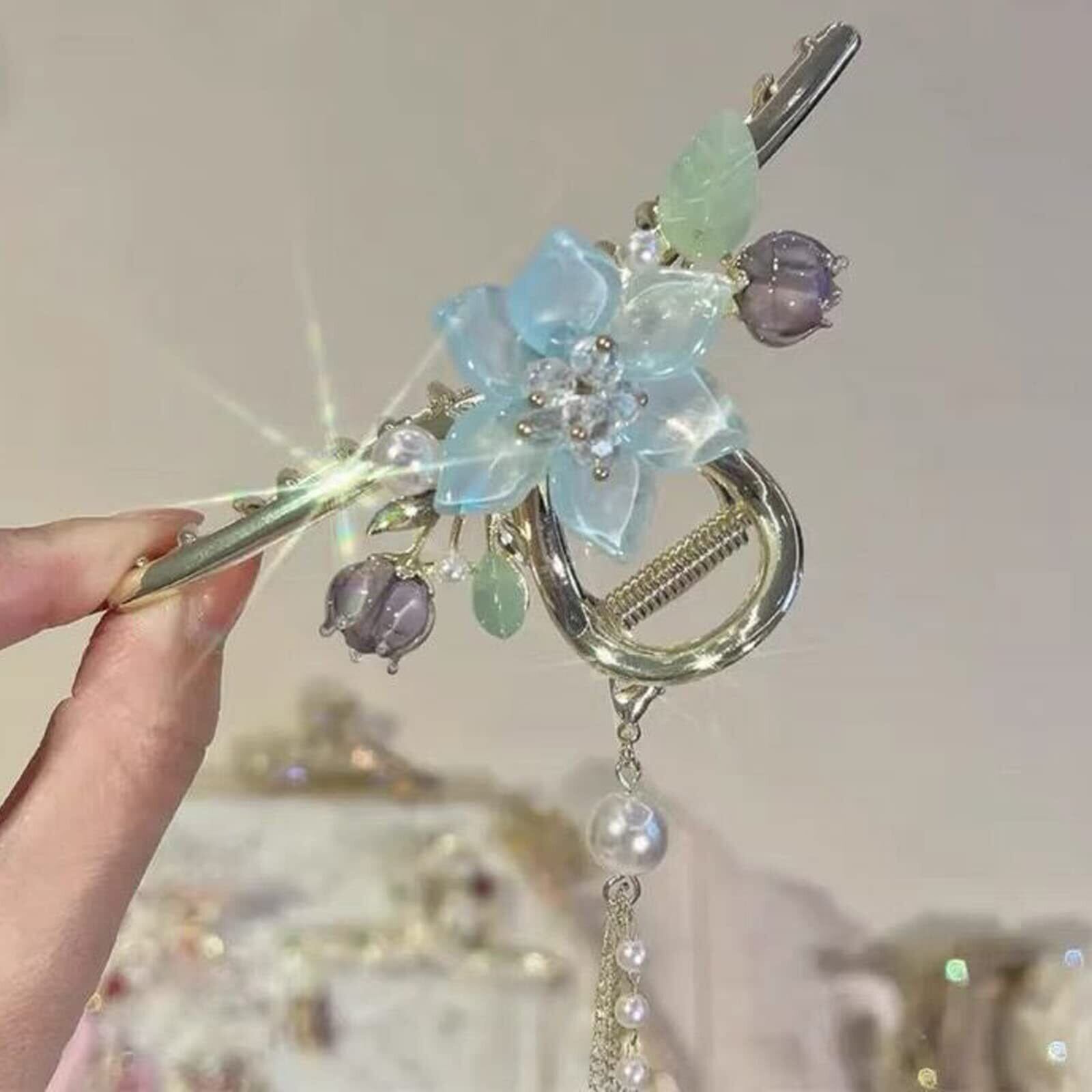 バンスクリップは耐久性のある軽合金/高品質のアクリル素材と模造真珠でできており、長時間美しい光沢を保ち、下がり飾りが歩くたびに揺れ、髪のオシャレをさりげなく彩ります