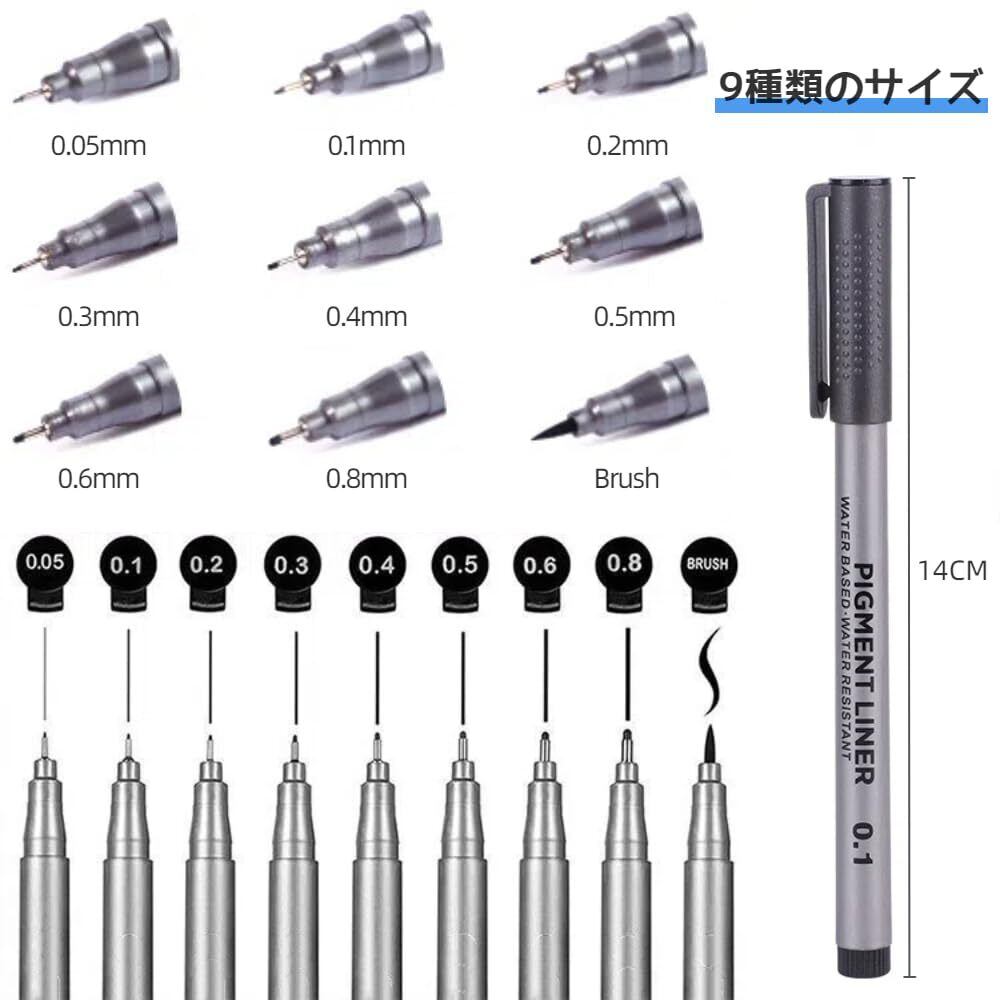 【内容】9点のペン、9種類サイズ0.05ミリ、0.1ミリ、0.2ミリ、0.3ミリ、0.4ミリ、0.5ミリ、0.6ミリ、0.8ミリ、1ミリで、異なる需要を満たす。