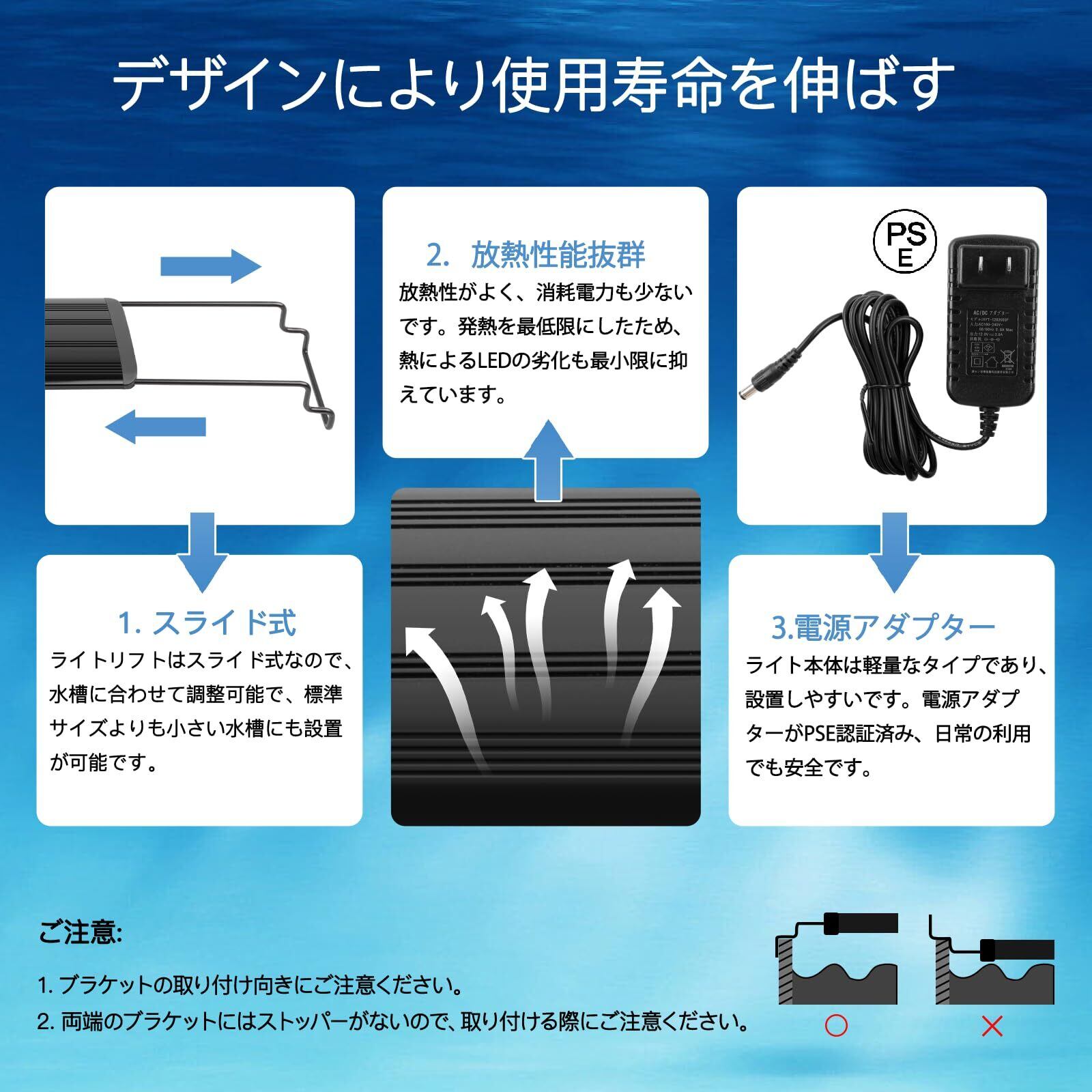 【高輝度LEDライト&10段階の明るさ調節機能】この水槽 ライトは60個の高輝度LEDライトを使用し、LEDライトは安定性が良いという特徴があり、水槽の隅々まで照らすことができます。 この水槽ライトは10段階の明るさ調節機能があり、1から10段階まで徐々に明るくなり、朝と夕方によって明るさを調節でき、水槽に活力を与えます。 水草、観賞魚の育成に最適です。