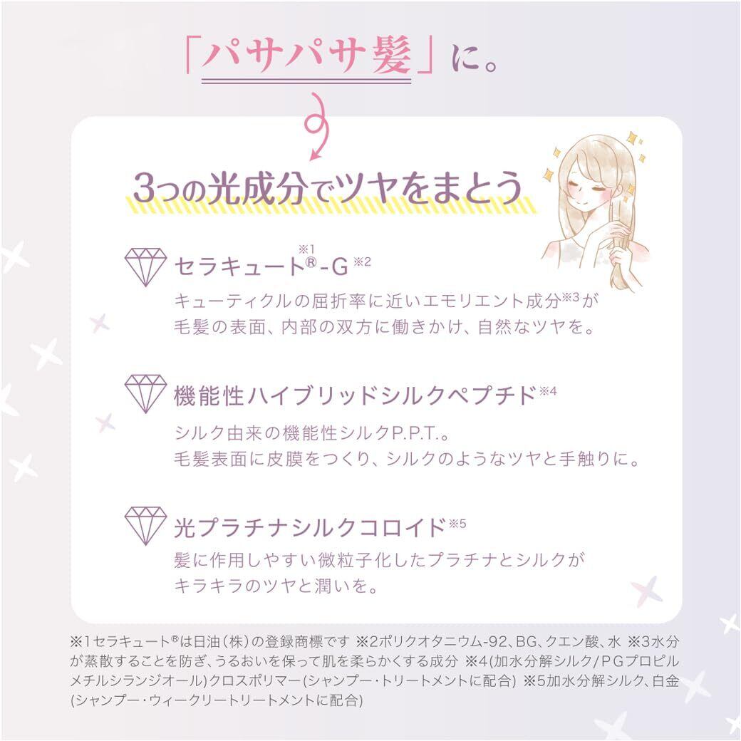 商品特長 キラキラ輝くツヤ髪に。保湿・手触り・ツヤ感を実感。サロントリート後のデイリーケアとしてご使用ください。