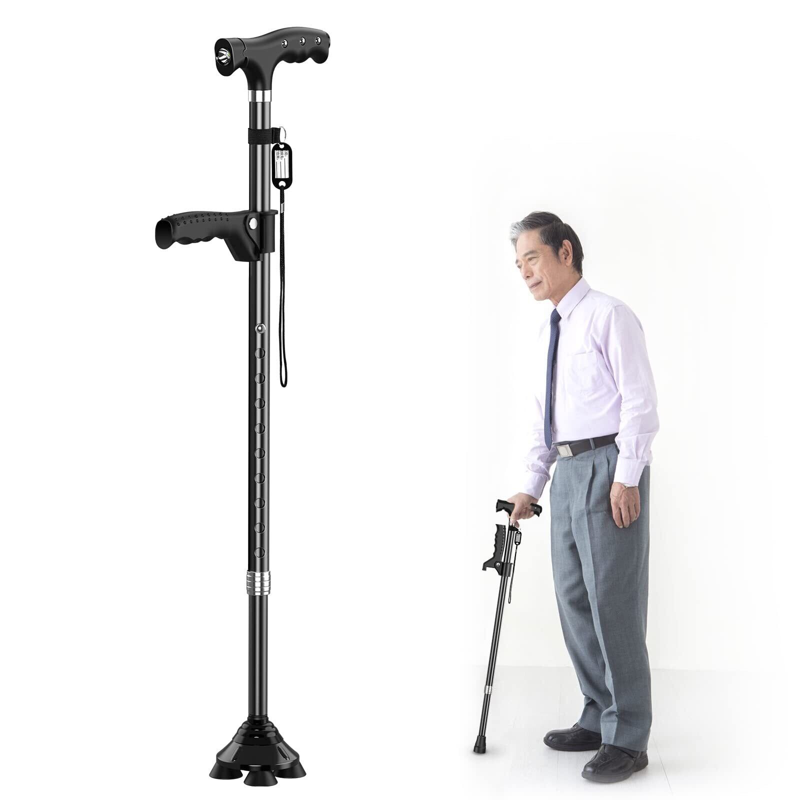 【数量限定】ステッキ 杖 倒れない 自立式4点杖 男女兼用 クレバーケーン伸縮式 軽量 アルミ製 補助ハンドル付き 高齢者 介護/歩行支援 松葉杖 LEDライト付き 夜間散歩 母の日 父の日 敬老の日 プレゼント 日本語説明書付き | Premium Stage