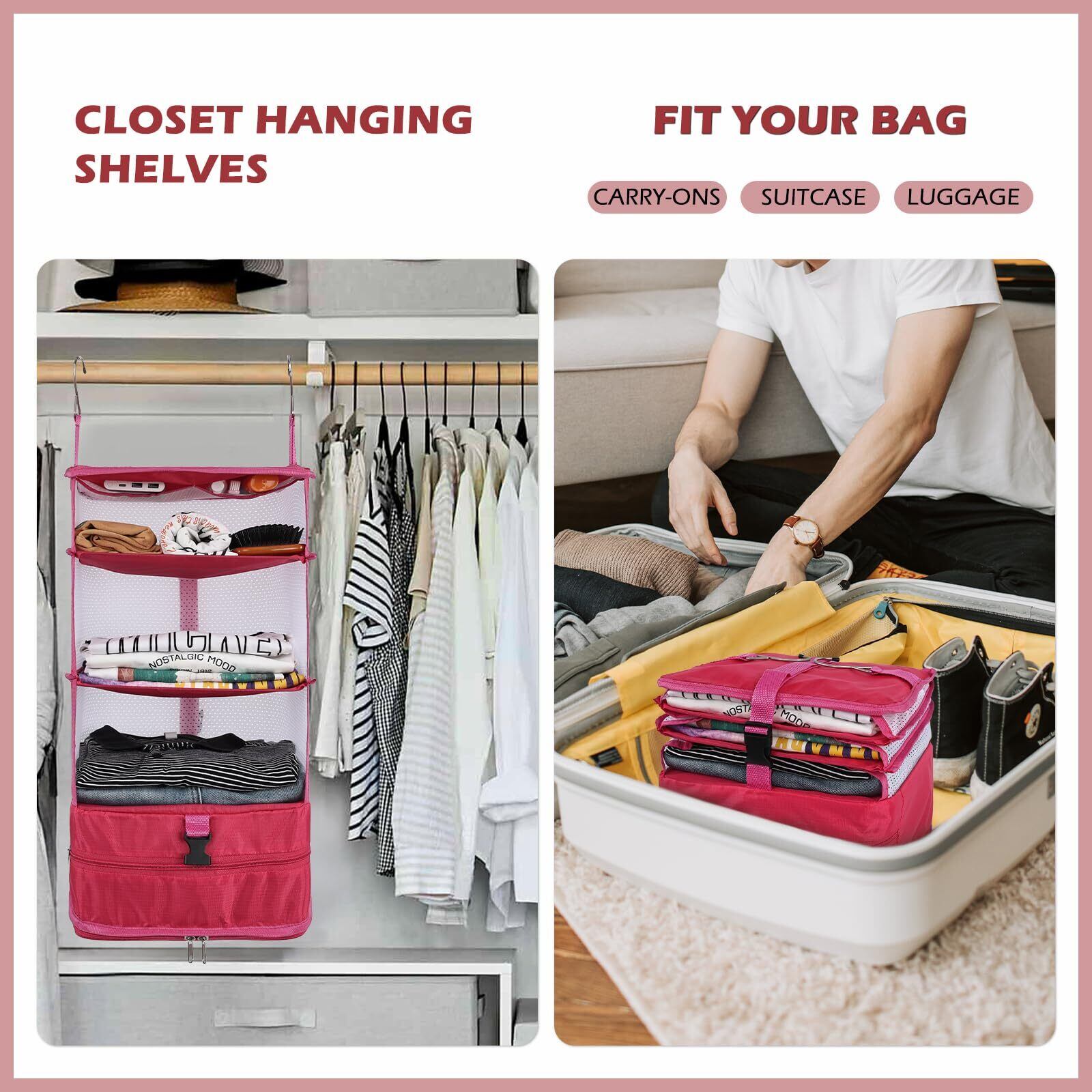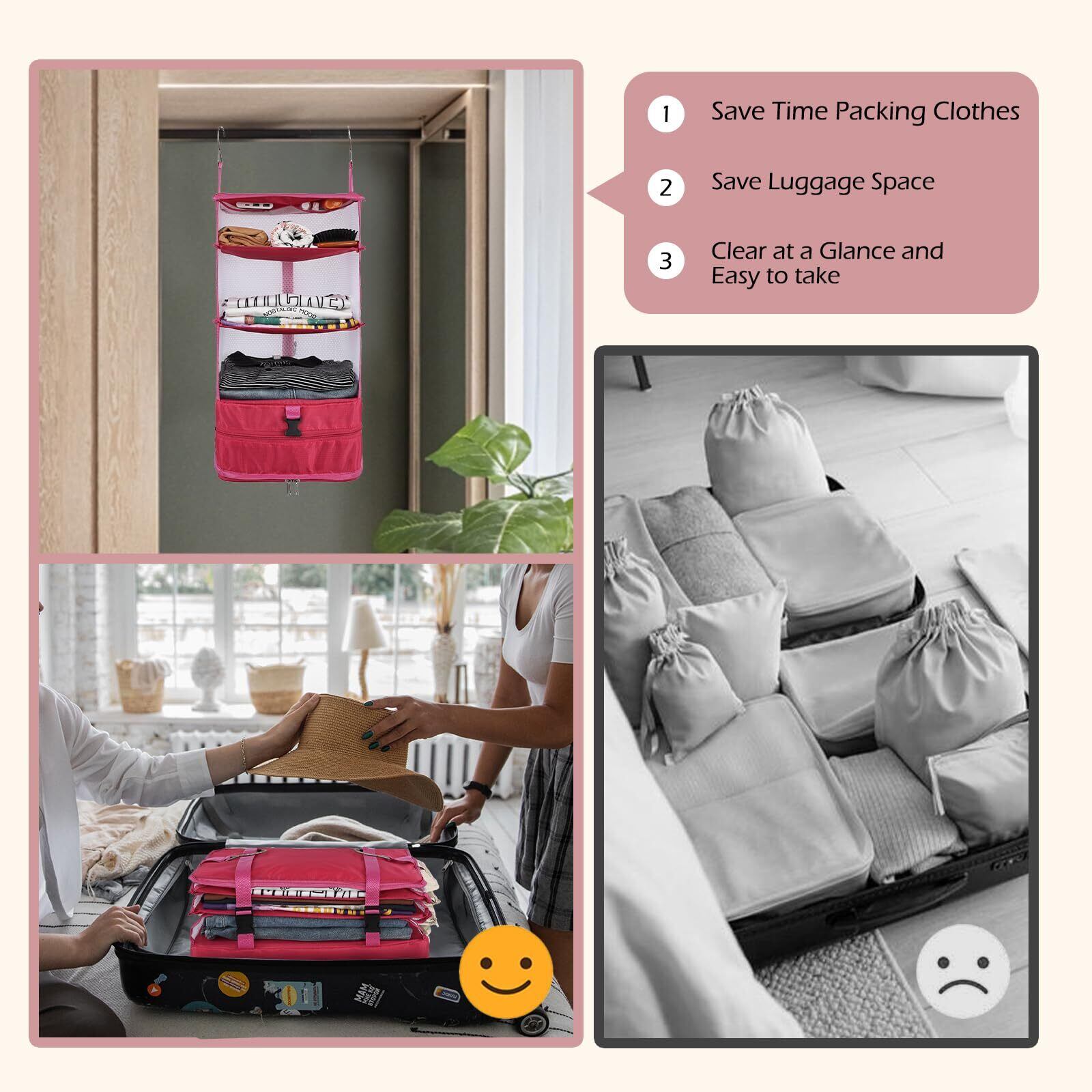 Surblue クローゼット 吊り下げ収納 4段 折りたたみ式 大容量 衣類ラック 旅行 出張 省スペース、2つのフック付き(L-ローズ)