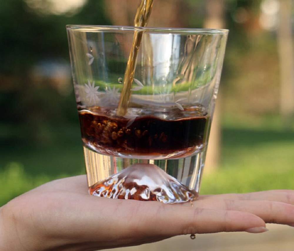 グラスの底にデザインされた富士山が、注ぐ飲み物の色によって様々に変化する様子が楽しいロックグラスです。