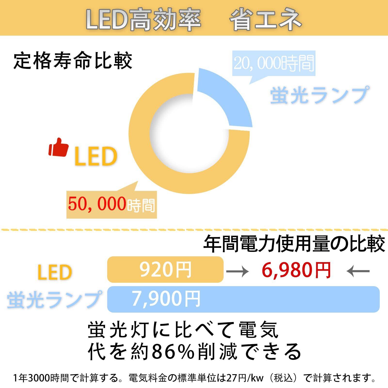 【明るさそのまま、高い省エネ性能】2023年最新型LEDチップを採用し、発光効率が高いため、明るさはそのままに省エネ効果が顕著です!LEDのエネルギー消費量は白熱灯の1/10で、電気代を大幅に節約することは財布にやさしい。LED照明器具の使用寿命は50,000 hで、長期的に交換しないのはお得です。発光が均一で目を保護することができます。早く新しい光源に着替えましょう!