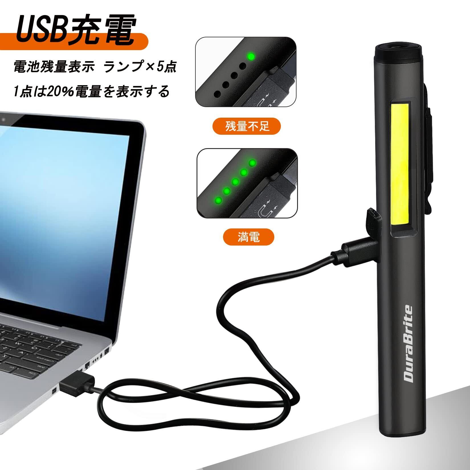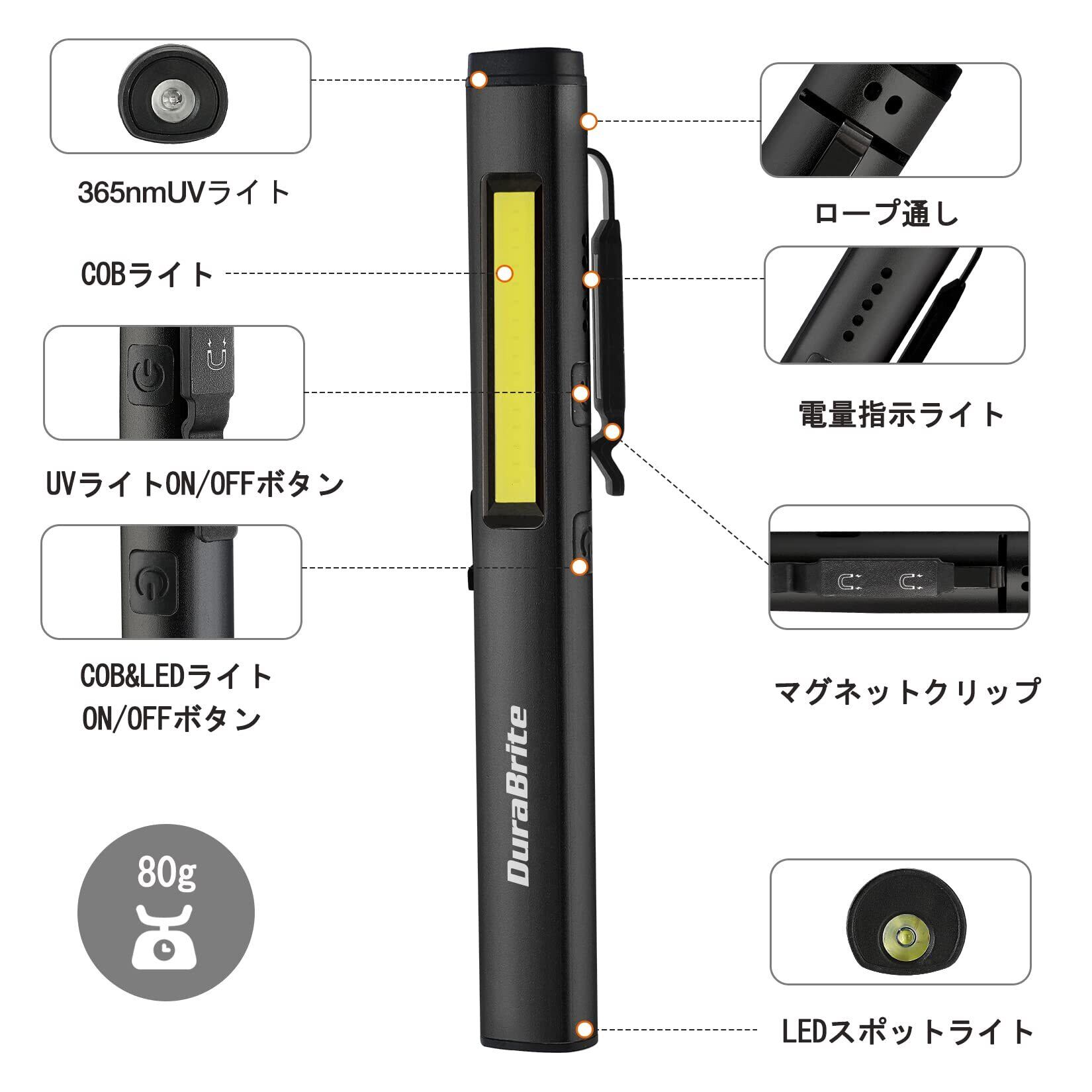 DuraBrite 懐中電灯 ハンディライト LEDライト ペンライト COBフラッドライト 365nm UVライト 紫外線ライト 多機能 USB充電式 小型 軽量 点検 偽札防止 鉱物鑑定 蛍光増白剤確認 ブラック