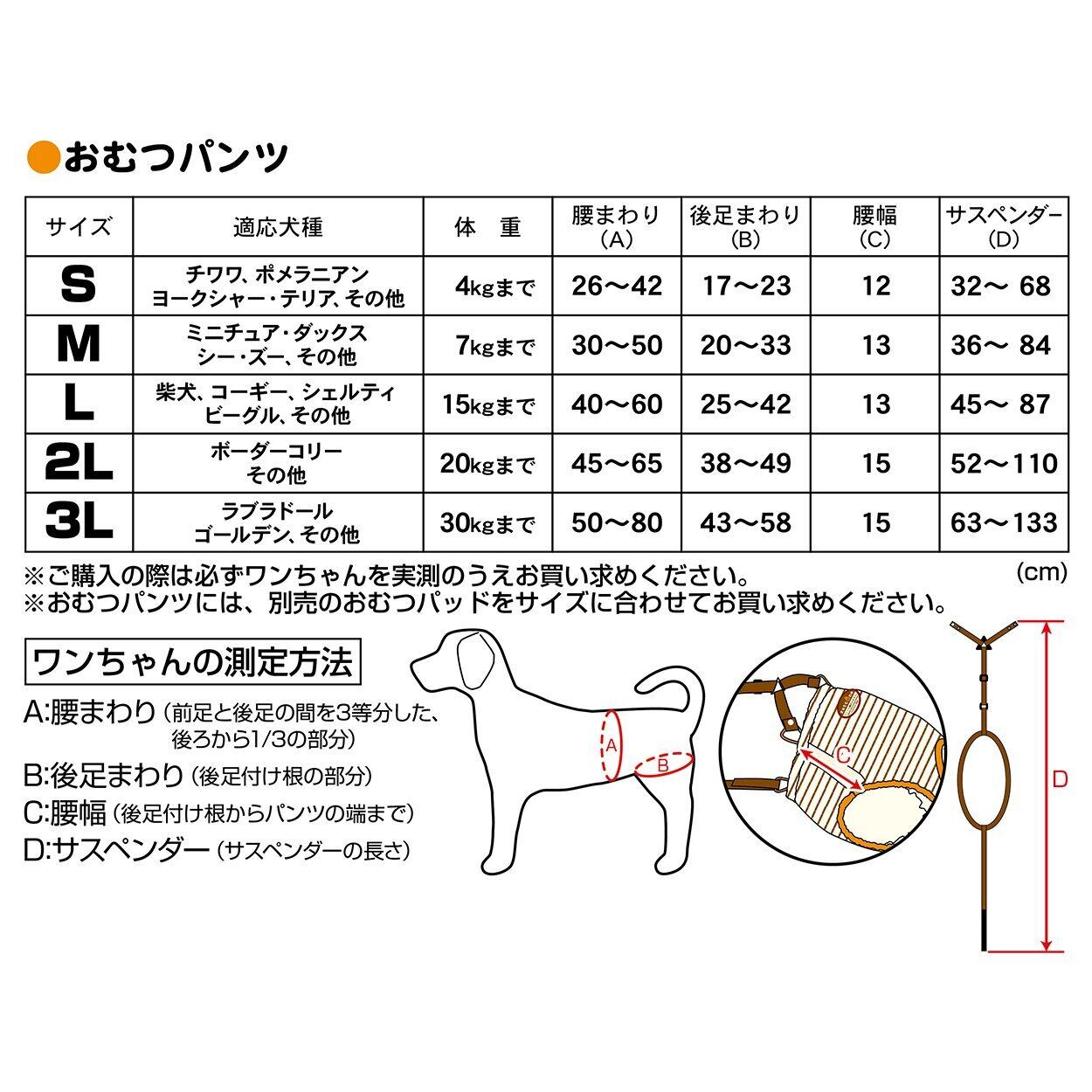 ※別売のおむつパッドとセットで使用してください。<おむつパンツの装着方法>1、お腹側の端におむつパッド(別売)の端を合わせてセットしてください。※おむつパッドの詳しい使用方法についてはおむつパッドのパッケージ裏面をご覧ください。2、おむつパンツのしっぽ穴にワンちゃんのしっぽを通します。※おむつパッドがずれていないか確認しながら装着してください。3、おむつパンツの両サイドの面ファスナーをしめ過ぎないように順に留めます。※ワンちゃんの毛を巻き込まないように注意してください。4、装着が完了したら、しっぽ穴を調節し、パッドとパンツにズレがないか確認しながら、おむつパンツがしっかりフィットするように調節してください。<サスペンダーの装着方法>1、おむつパンツの装着後、サスペンダーの輪になっている部分にワンちゃんの頭を通します。※面ファスナーが付いている部分をお腹側にしてください。2、サスペンダーの面ファスナーが付いている部分を、おむつパンツのお腹側にあるベルト通しヒモに通します。※ワンちゃんの毛を巻き込まないように注意してください。3、サスペンダーのホックが付いている部分を、おむつパンツの背中側にあるベルト通しヒモに通します。4、背中側にある調節具を動かして、緩みがなくなるように調節してください。※ワンちゃんの首がしまり過ぎていないか確認してください。