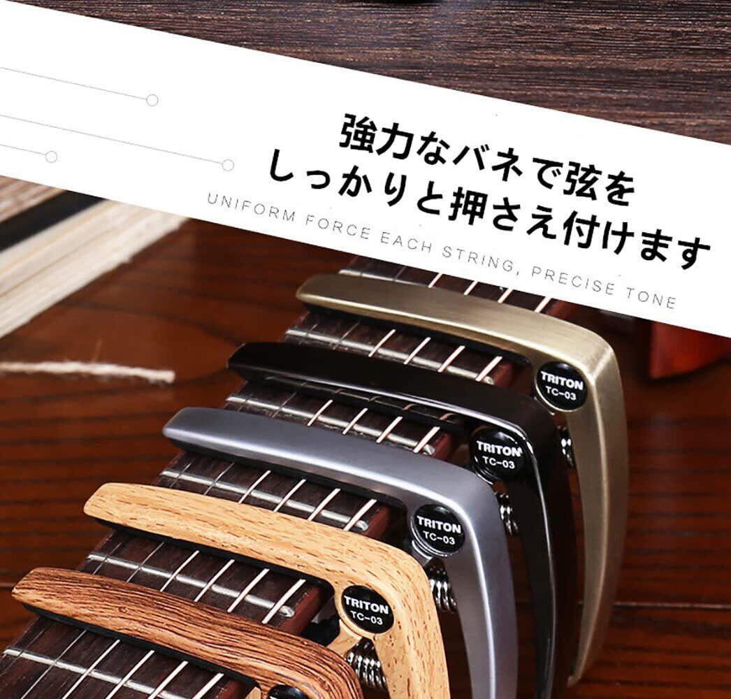 【ホールド力強い】強力なバネで弦をしっかりと押さえ付けます。カポタスト選ぶときに、全ての弦が正しくホールドされなければ、本来の音が出ません。当製品は、内蔵の強力なバネが細い1弦まで確実に押さえ、洗練された音色を響かせることをお約束します。また、指板面・ネック面にはシリコンを使用しているので、あなたの大切なギターを傷付けることがありません。