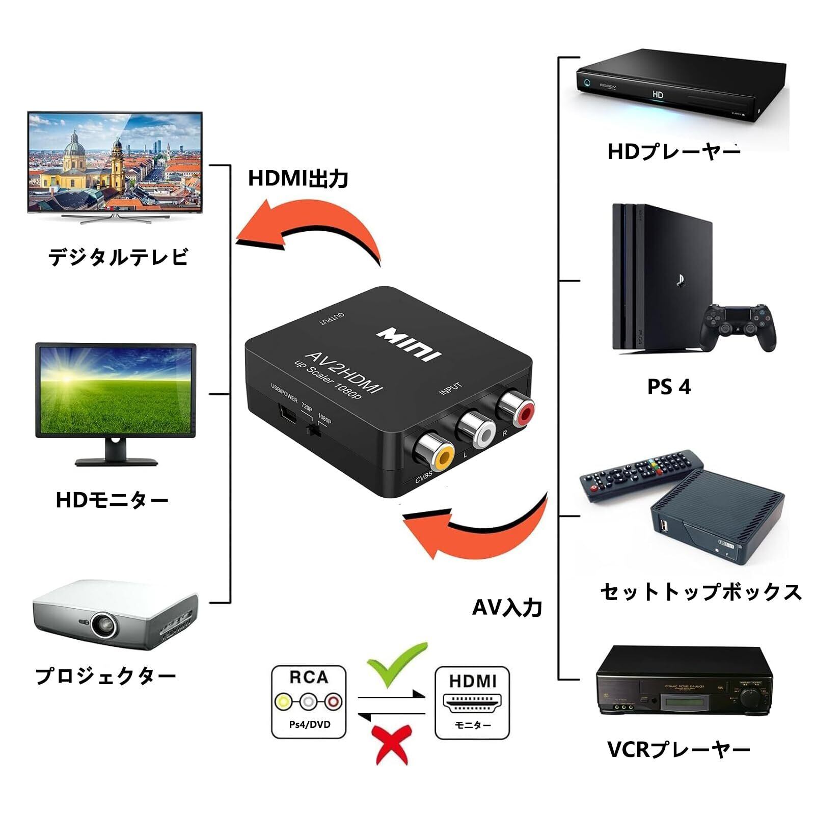 AV to HDMI:本機はアナログであるコンポジットビデオ信号をデジタルであるフルハイビジョンHDMI信号 に変換するコンバーターです。逆方向(HDMI to AV)にはご使用できません。
