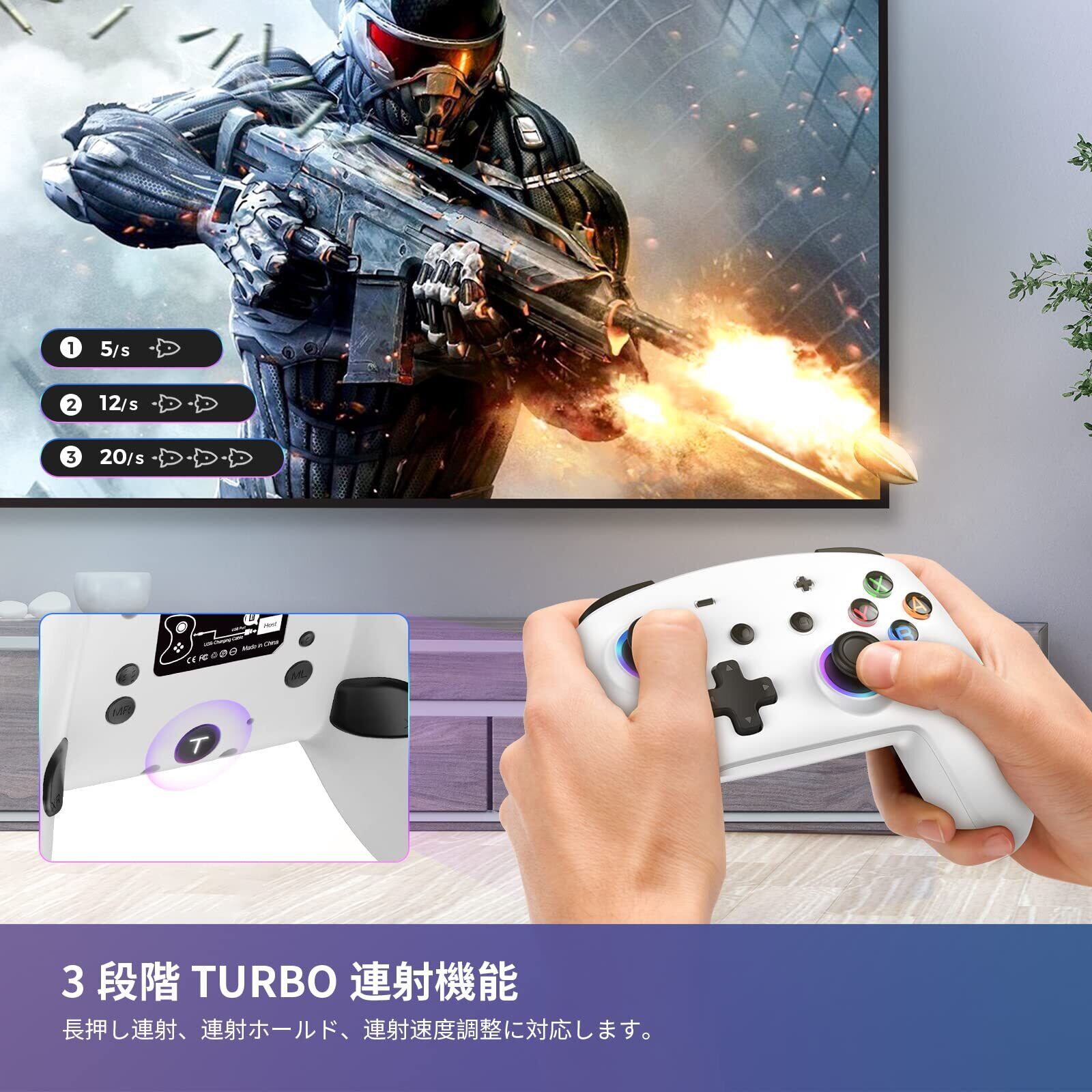 【連射機能付き&速度調整可能】コントローラー背面にTURBOボタンがあり、連射機能を設置することで、手をボタン連打の作業から解放して、長時間ゲームする時の疲労感を軽減してくれます。 また、連射速度も3段階の微調整ができます。