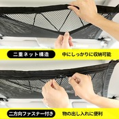■サイズ:80x53cm ご注意:車内に四角固定用のアシストグリップ等があることをお確認ください。荷物が多い場合に天井スペースを有効に活用出来るダブルファスナー式の天井収納ネットです。ラゲッジネットには伸びにくい材質を採用するため、重さで下に垂れたりすることなく、運転の視界をしっかり確保し、快適なドライブを楽しめます。開口が大きくて、荷物の出し入れに邪魔なし!