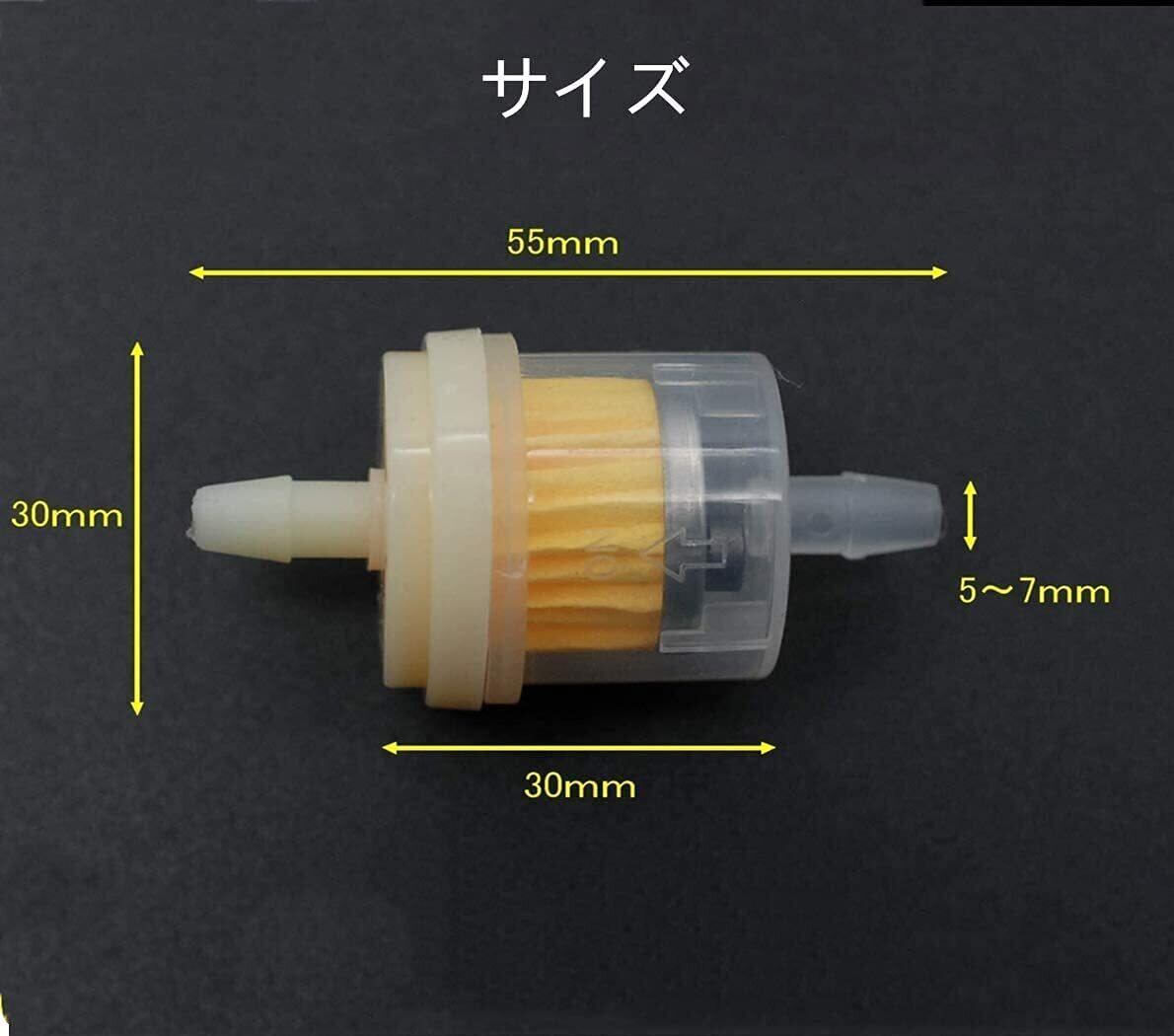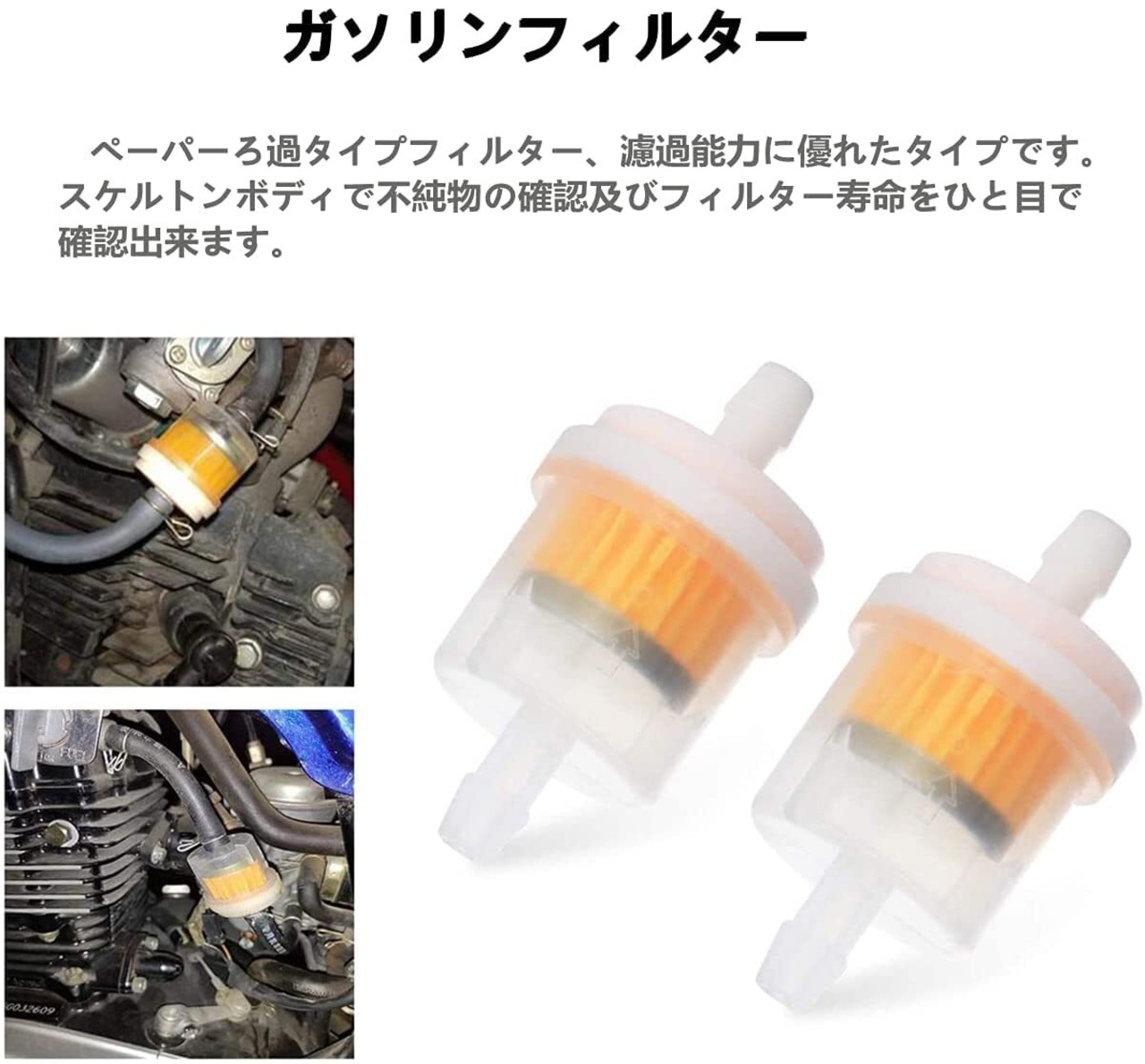 【製品情報】汎用タイプ燃料フィルター2個、燃料ホース約20cm2本、ホースバンド6個計10点のセットです。サイズ:ホース内径6/8mm用ペーパー、長さ21ミリメートル。