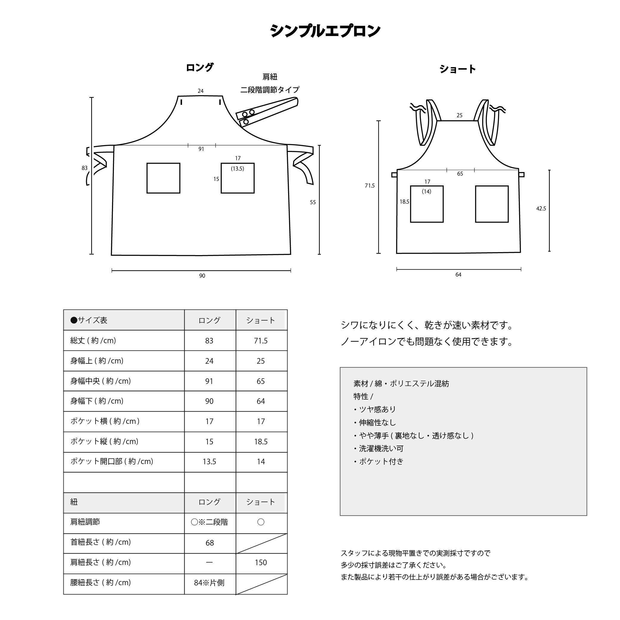 【バリエーション】◇身長(丈)に合わせて、「ロング」「ショート」の2タイプからお選びいただけます ◇ロング丈とショート丈があるので、男女お揃い、親子お揃いが可能です ◇レストランやカフェの飲食業、エステや介護などのユニフォームにも2サイズでお洒落にそろえる事が可能です