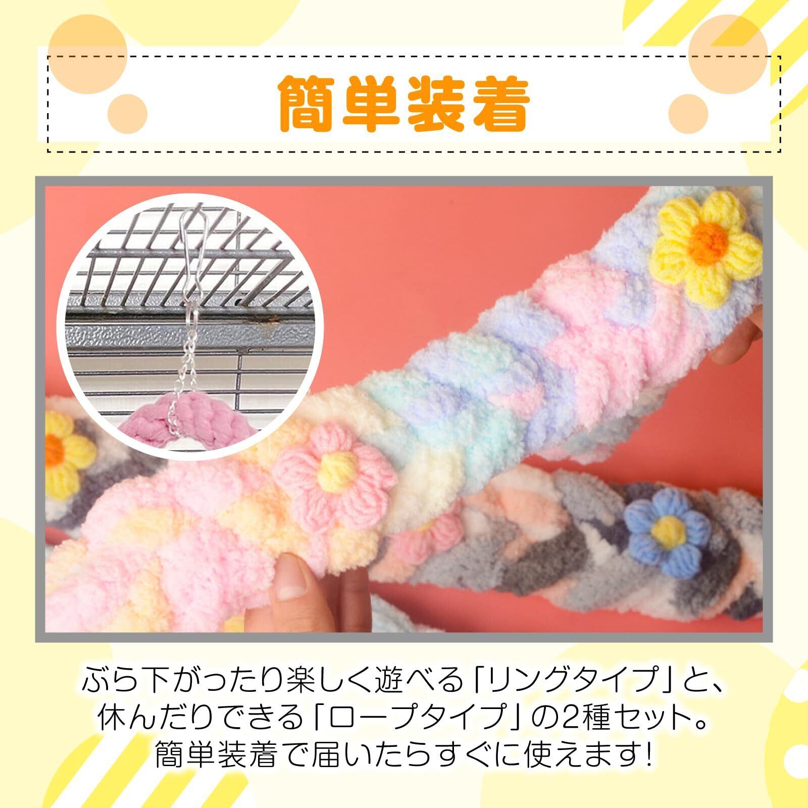 モモンガや小動物、小鳥などに!ペットが喜ぶ2点セットです。登ったりぶら下がったり楽しく遊べる「リングタイプ」と、上を渡ったり休んだりできる「ロープタイプ」の2種セット。フックがついているため、簡単装着で届いたらすぐに使えます!