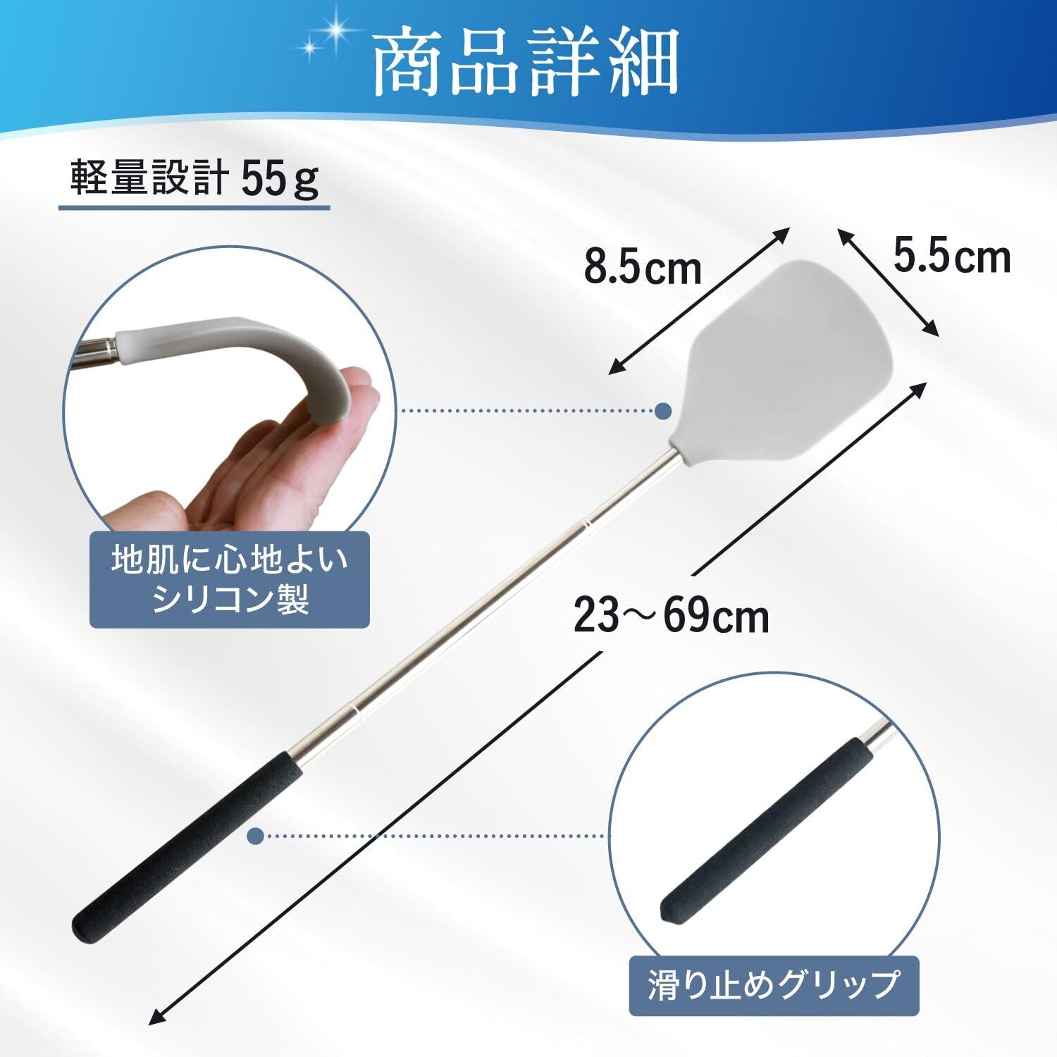 23cm~69cmの範囲で伸縮可能。体のサイズに合わせたお好みの長さに伸ばしてお使いいただけます。背中や腰など難しい箇所でもスムーズにローションを塗ることができます。