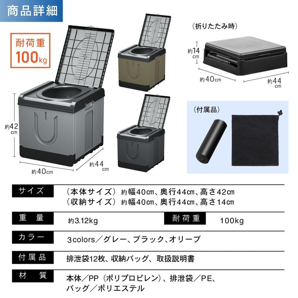 【仕様 / セット内容 /メーカー保証】【仕様】本体サイズ:約幅40cm奥行44cm高さ42cm(使用時)、約幅40cm奥行44cm高さ14cm(収納時)、重量:約3.12KG、容量:約70L、材質:本体(ポリプロピレン)、バッグ(ポリエステル)【セット内容】本体、排泄袋×12枚、収納バッグ、取扱説明書【メーカー保証】PYKES PEAKは日本のメーカーです。カスタマー対応も日本人スタッフが日本語で丁寧に対応いたします。初期不良や故障などの場合は、ご気軽にご連絡ください。製品保証を含めご対応させて頂きます。