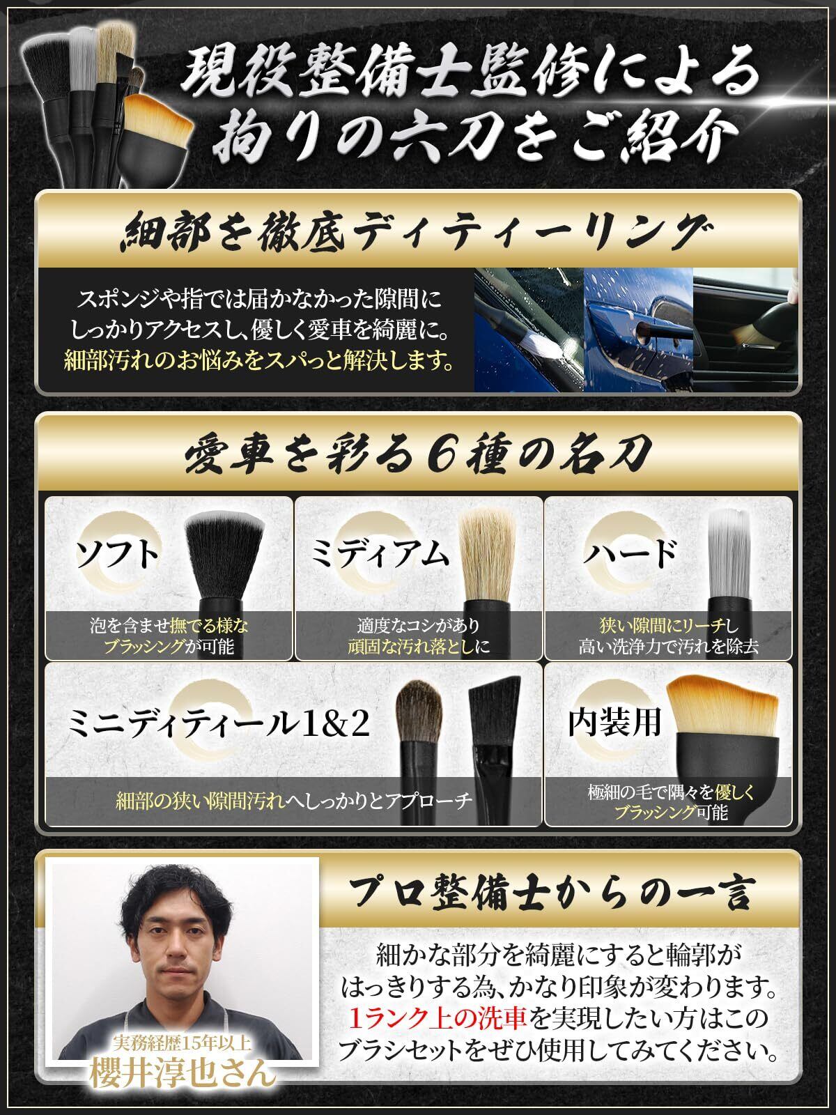 【落としきれなかった細部汚れがスッキリ!】洗車のプロに監修を頂いた拘りのディテールブラシ。お車の内装・外装あらゆる狭い隙間の汚れ落としに最適な洗車ブラシ6本セットです。