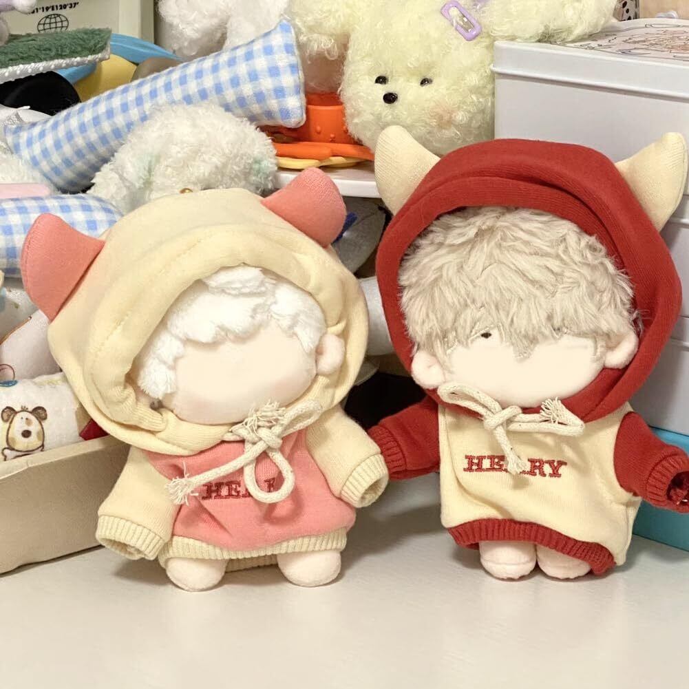 YUYAKESHI 綿人形の服 人形服 着替え 10-15cmぬいぐるみ用 ゆるい フード付きパーカー 人形 かわいい 上着 ウシの角付 ぬいぐるみ(レッド帽子)
