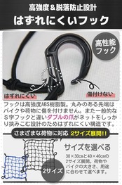 【はずれにくいフック 】フックは高強度ABS樹脂製。丸みのある先端はバイクや荷物に傷を付けません。また一般的なS字フックと違いダブルの爪がネットをしっかり挟みこむ設計のためはずれにくい構造です。
