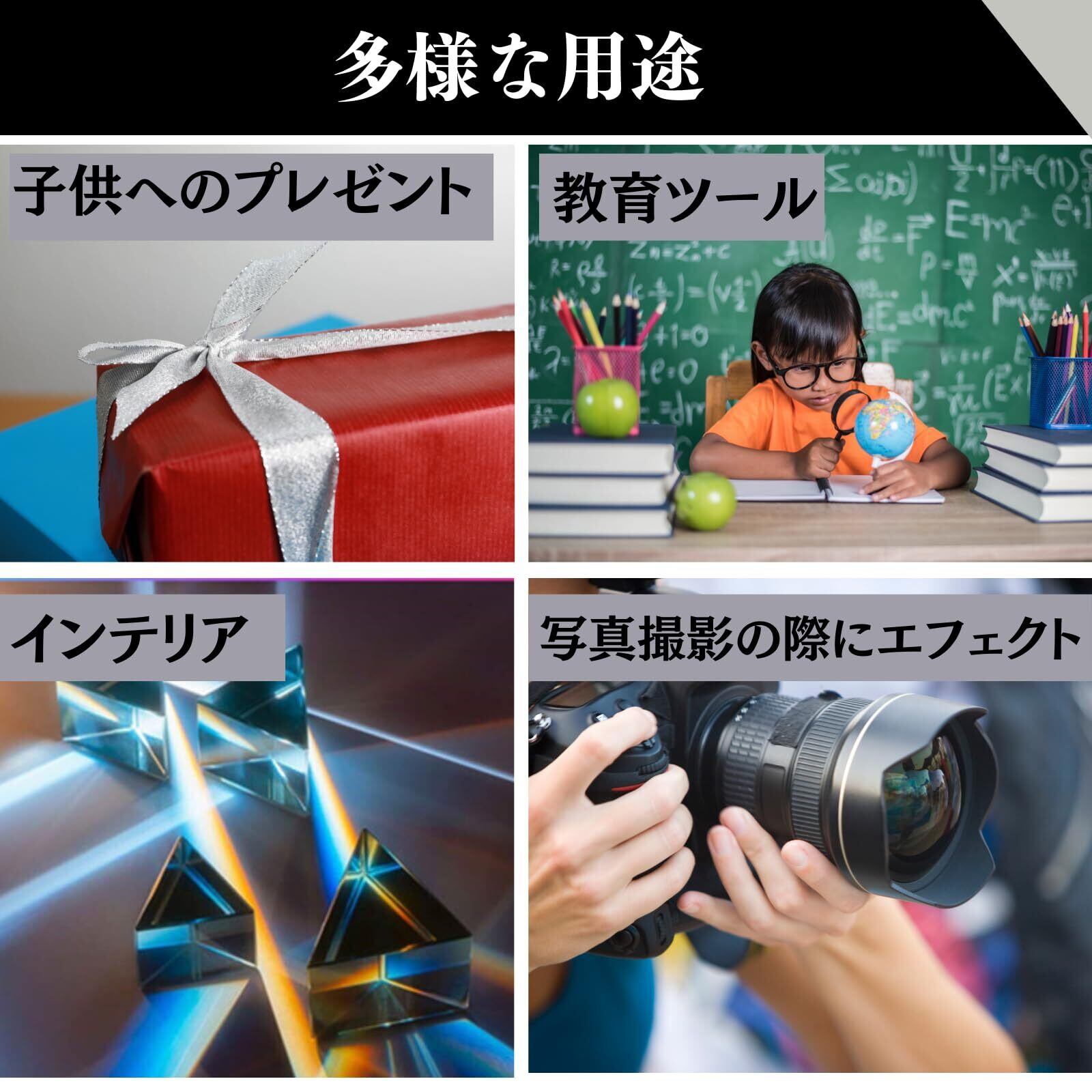 【商品の特徴】①三角プリズム:光を美しい虹色に分解する ②角柱プリズム:光の屈折や反射 ③立方体プリズム:複数の面で光の色分散。組み合わせることで、より複雑な光を生み出し、暗い部屋に虹色の光の芸術を作り出すことができます。