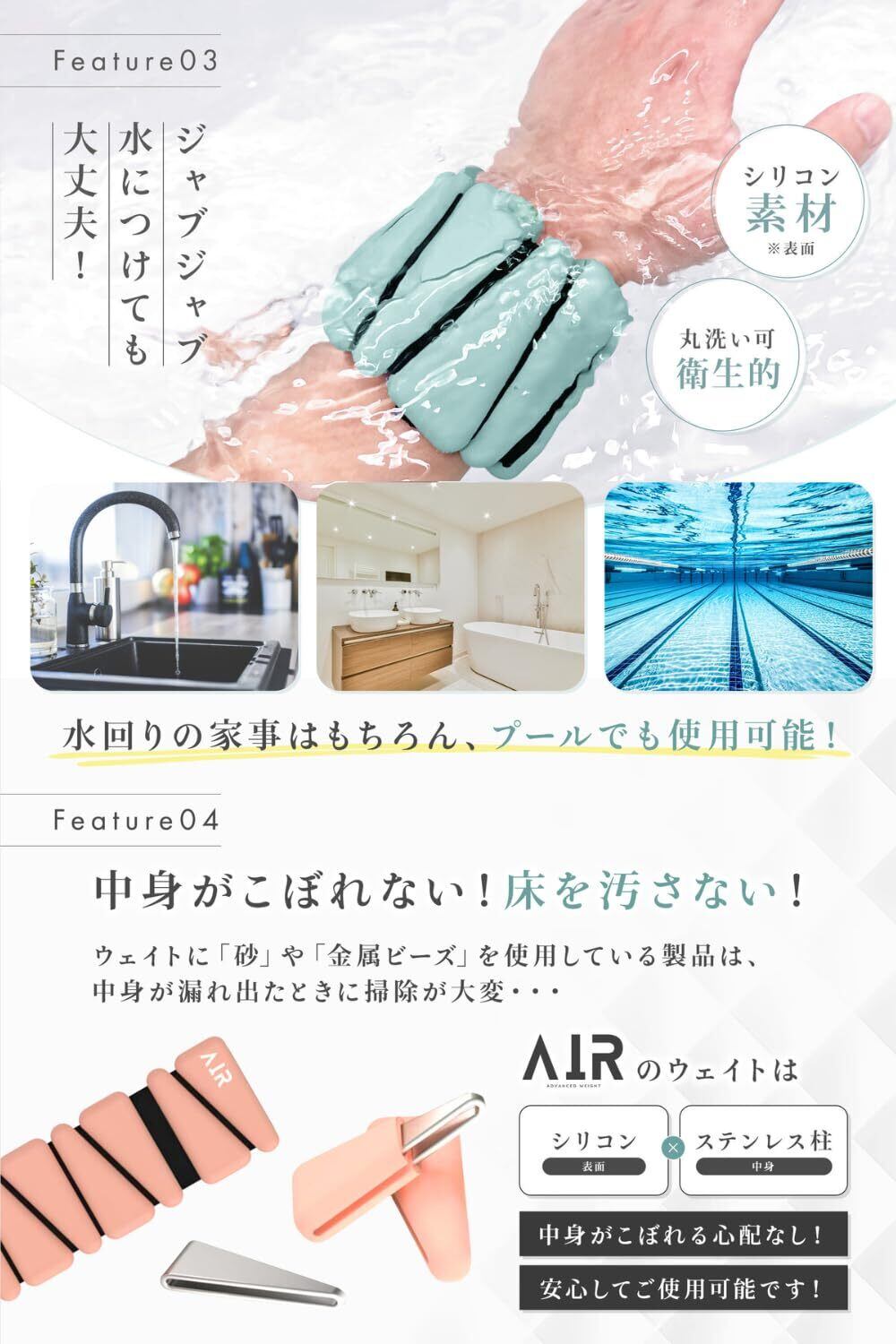 【水中で使用可能】ウェイトに砂を使用していないため、水を一切気にせずご使用可能です。この特性により、皿洗い、お風呂掃除といった水回りの家事は勿論、プールでの水泳、ウォーキングなど水中での使用も問題なく可能となっております。
