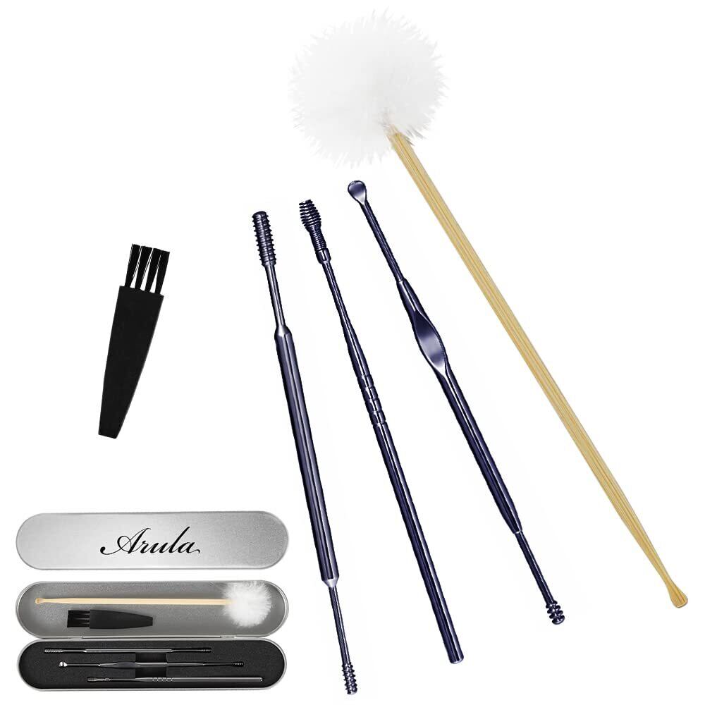 耳かき 【竹耳かき付き】【ブラシ付き】【美しいブラック】ステンレス 竹製 こだわりの先端6種類4本セット 金属スクリュー型 スプーン型 コイル型 専用ブラシ 専用ケース付き 美しい光沢 水洗い清潔 耳掃除 みみかき アルーラ (竹耳かき同梱クロームブラック)