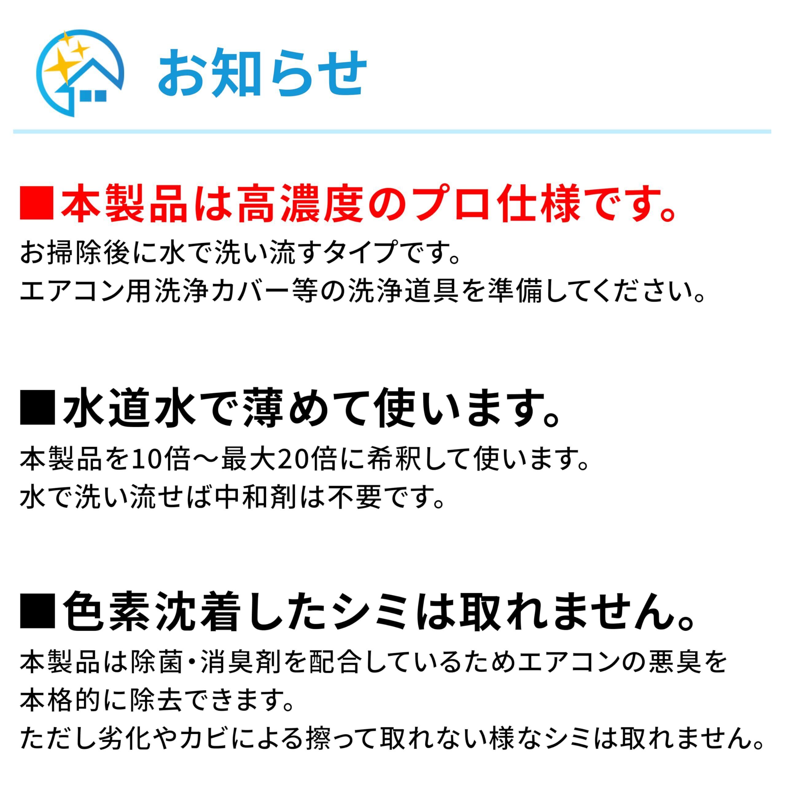 カビ取り防カビ対策専門業者がエアコンクリーニング掃除のために作った業務用クラスのプロ仕様 強力 エアコン洗浄剤です。泡立ちも少なく10~最大20倍まで薄めて使えます。