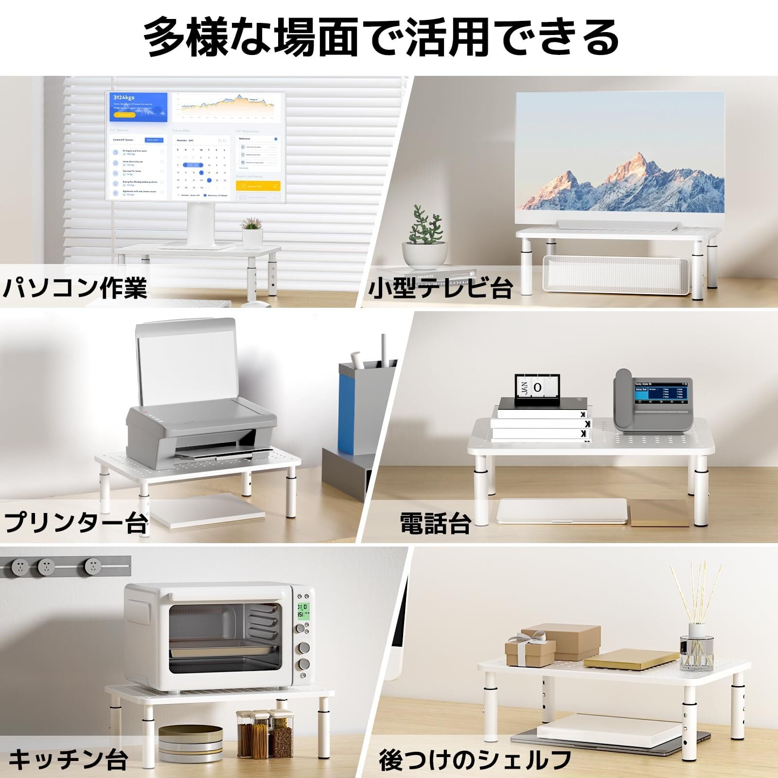 【実用的な機能】モニター台にPCディスプレイを載せて、キーボードなどをモニター台の下に収納して、モニター周りのスペースをより多く活用することができます。また、モニター台を置いて目線が数センチ高くなるだけで姿勢がよくなるので、体の負担を減らしてパソコン作業も楽に行えるようになります。