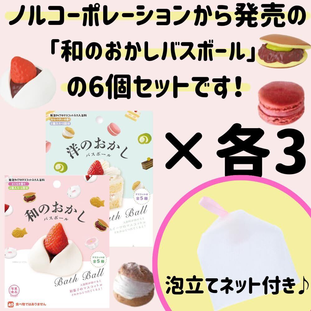 【各3個合計6個セット+泡立てネット付き】ノルコーポレーション バスボール 写実食品シリーズ 洋のおかしバスボール 和のおかしバスボール マスコット入り 香り付き おもちゃ 入り バスボム バスグッズ 炭酸 キャラクター スイーツ ケーキ 【バスタイムにあって便利な泡立てネット付き】