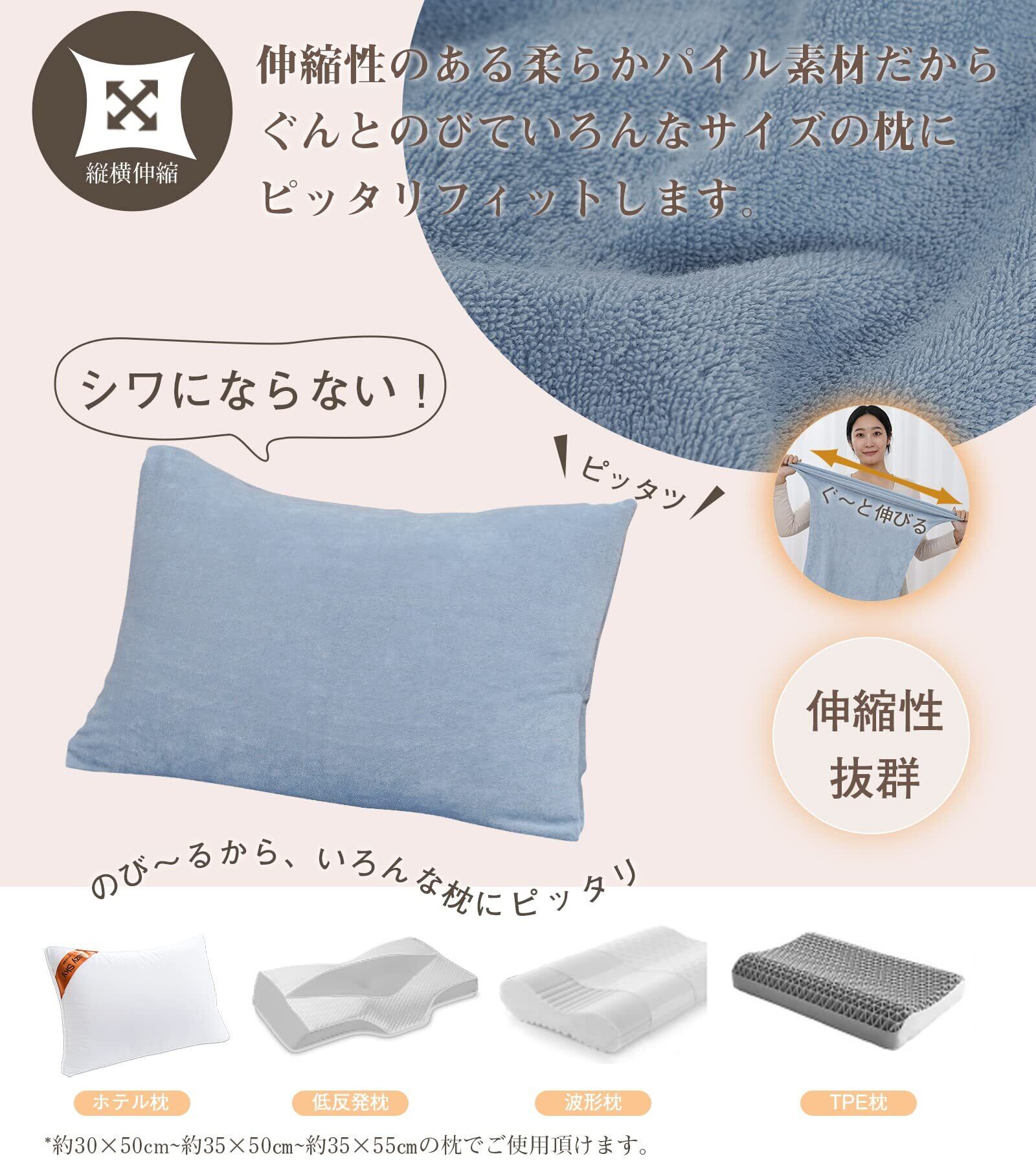 【のびのび素材であらゆる枕にフィット】:枕カバーの本体サイズ:約32×約48㎝。タテ・ヨコ自在にぐんぐん伸び、お使いのまくら(低反発枕、カーブ形状の枕、変形した形の枕など)をしっかりカバー。約30×50cm~約35×50㎝~約35×55㎝の枕にも対応できます。まくらカバーの素材:パイル部分:綿100%、グランド部分:ポリエステル95% ポリウレタン5%。