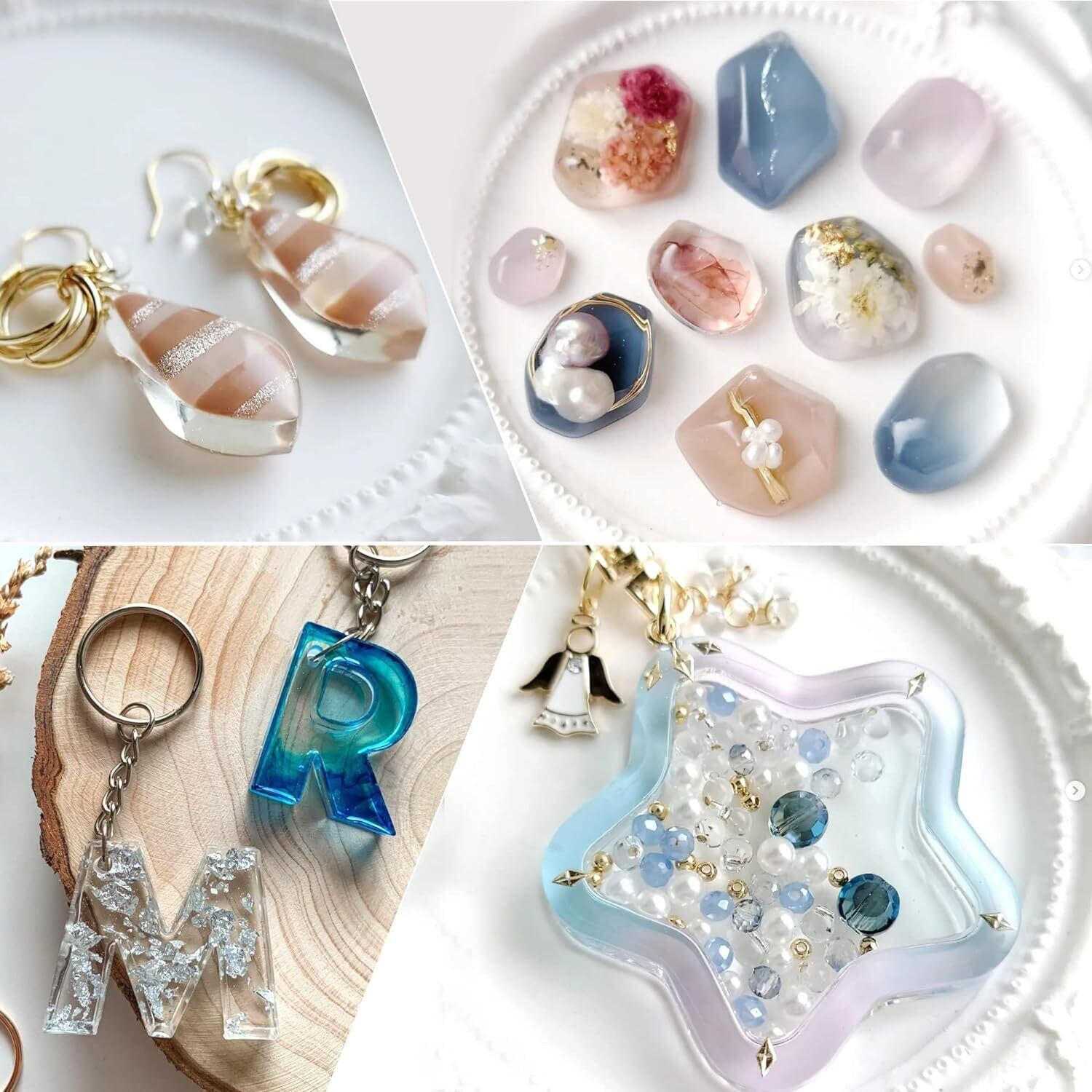 【幅広い用途】200gの大容量!コスパがよい!UVレジンクラフトに興味を持つ家族や友達へのプレゼントとして最適です。ピアス、ヘアゴム、ネックレス、キーホルダー、スマホケースなどに使用できます。このように、アクセサリー以外にもオリジナルの文房具や小物もレジンで簡単に作れます!