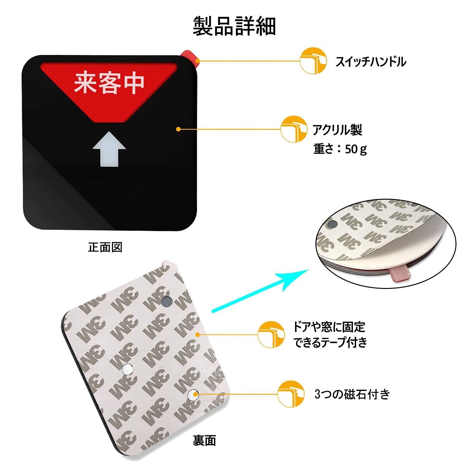 【使用】「来客中」、「取込中」、「在室」と「不在」の間にスライドして切り替え可能。会議室、プライベート会場などに適用。防水性、耐久性があり、取り付けも簡単。