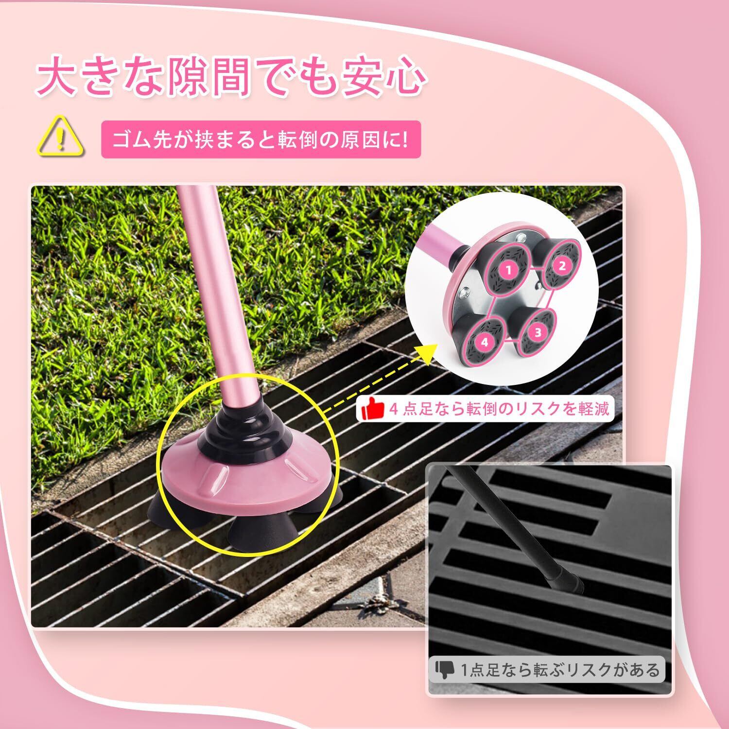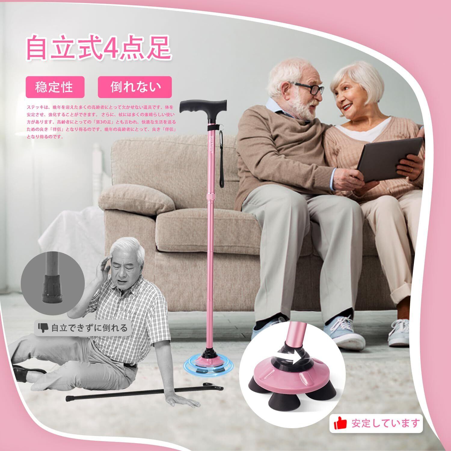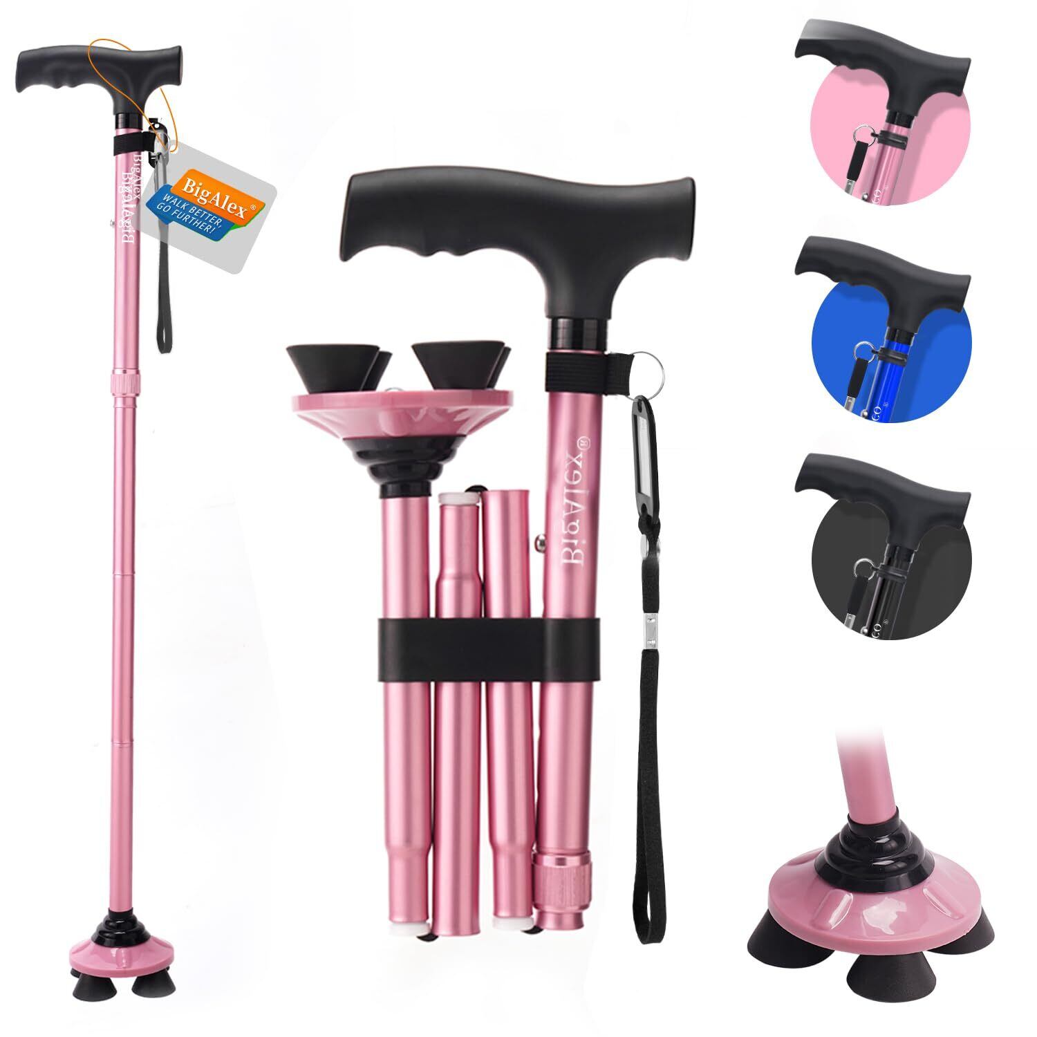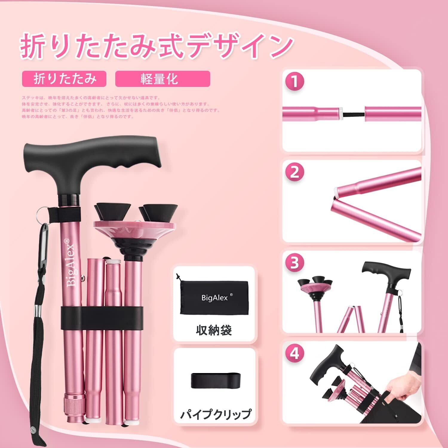 ビグアレクス(BigAlex)折りたたみ杖 ステッキ 自立杖 ピンク女性 5段階調節 おしゃれ 倒れない 高齢者 介護 軽量 アルミ 長さ調整可能 歩行支援 夜間散歩 母の日 父の日 敬老の日 プレゼント (86-96センチ, ピンク)