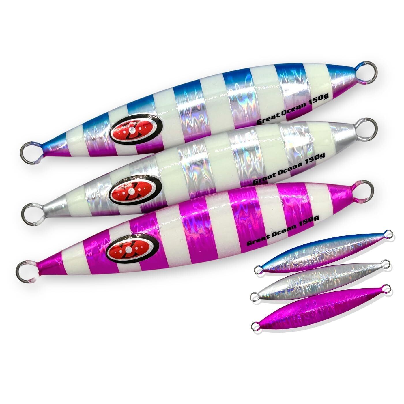 【重量】150g 【横幅】135mm【カラー】ブルー&ピンク・シルバー・ピンク / 3本入り【素材】金属製、鉛を使用し、耐久性と性能を兼ね備えています。【表面】片面ゼブラ蛍光コーティングによる蓄光塗料を施し、夜間や深場でも効果的にアピール。これらのジグは、あらゆる釣りに対応し、初心者から上級者まで満足のいく性能を発揮します。