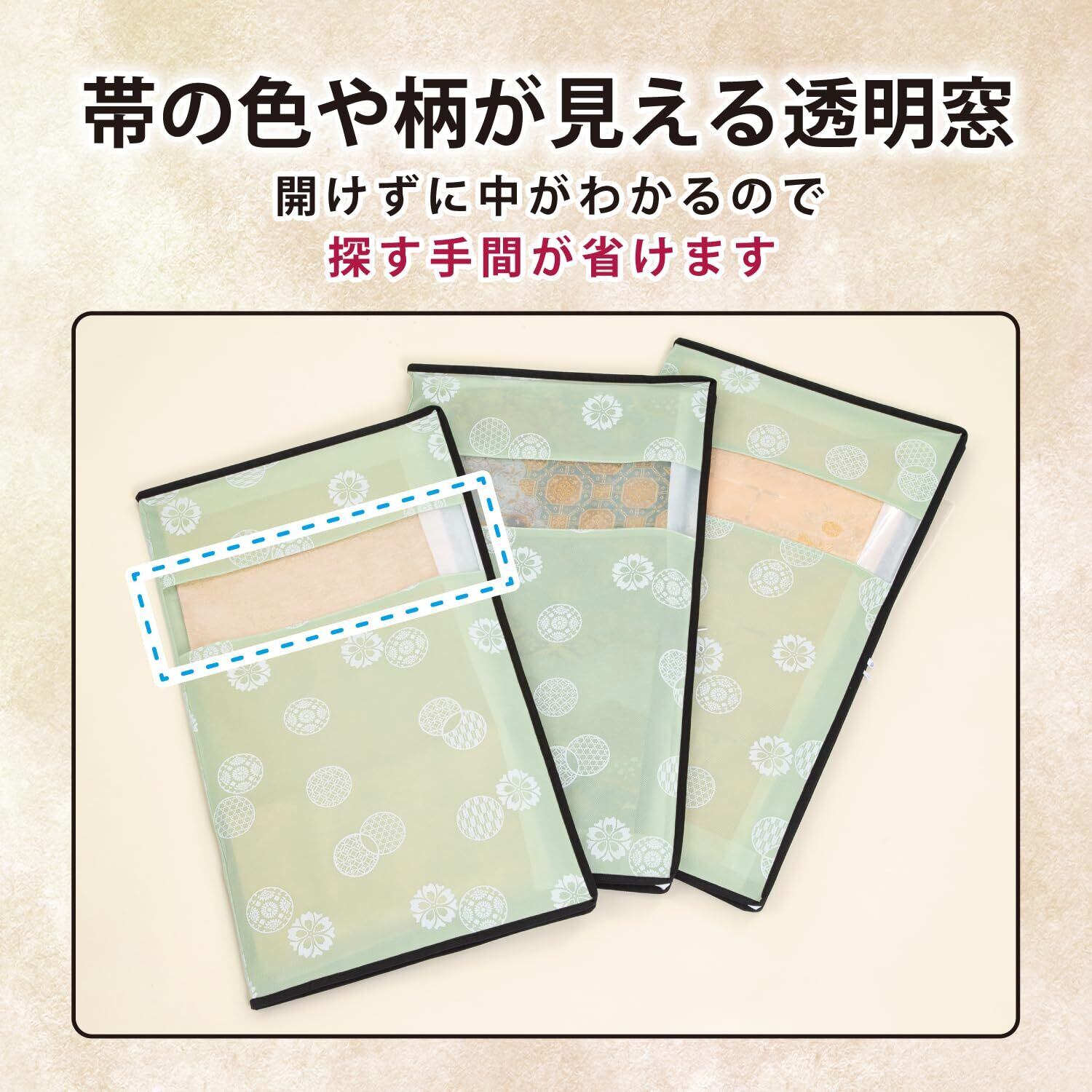 【透明窓付き・折りたたみ可能】:透明窓付きで入れたまま帯の色や柄の確認ができ管理しやすい。淡いグリーンの生地にオリジナルのモダンな和柄をプリント。使わないときは折りたためてコンパクトになるので場所を取らずに保管可能。子ども用の着物や浴衣の収納にも使える。