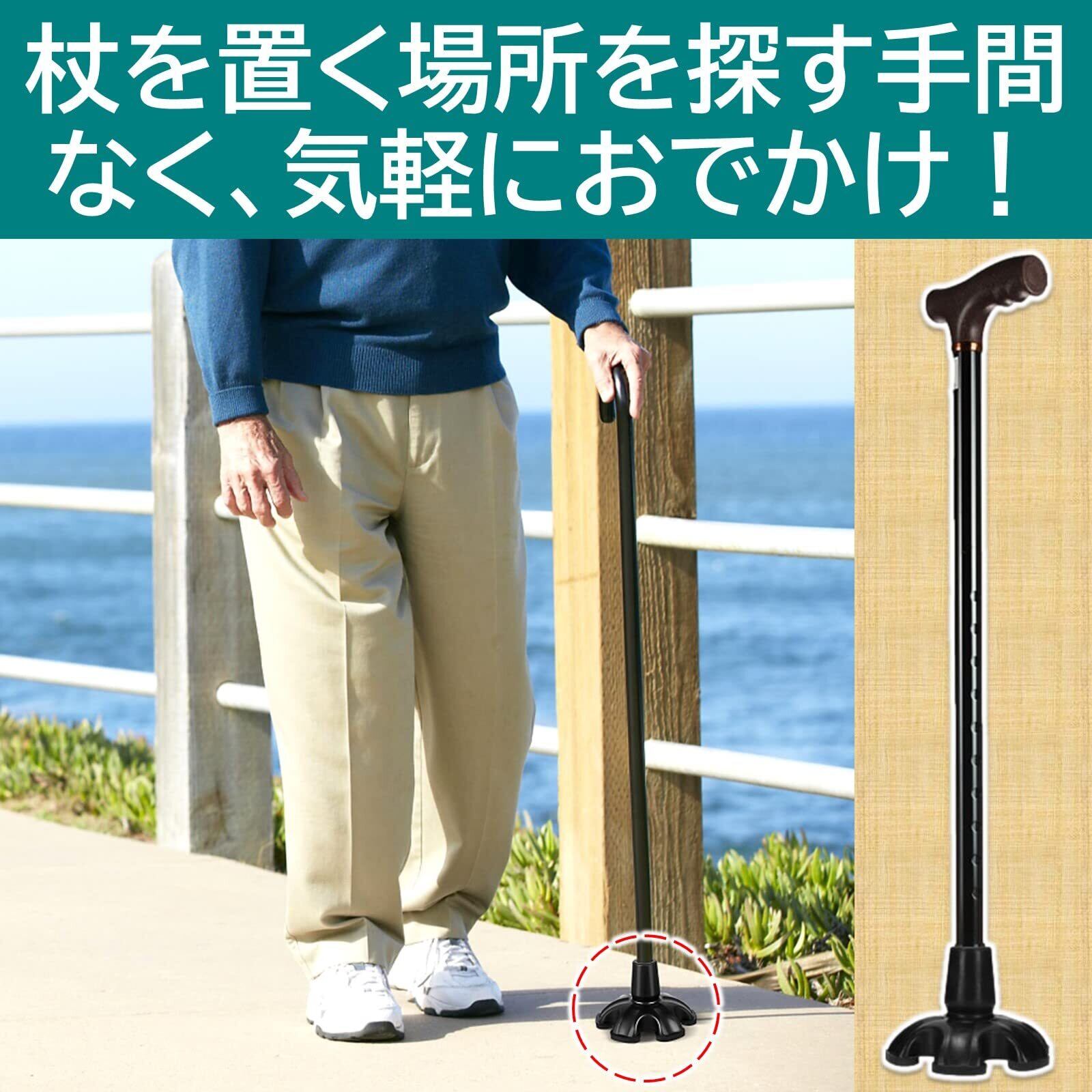 杖を置く場所を探す手間がなくなり、いつでもストレスなく外出することができます。大きなゴム脚があることで地面との接地面が増え、しっかりと杖で体重を支えながら安定して歩くことができます。