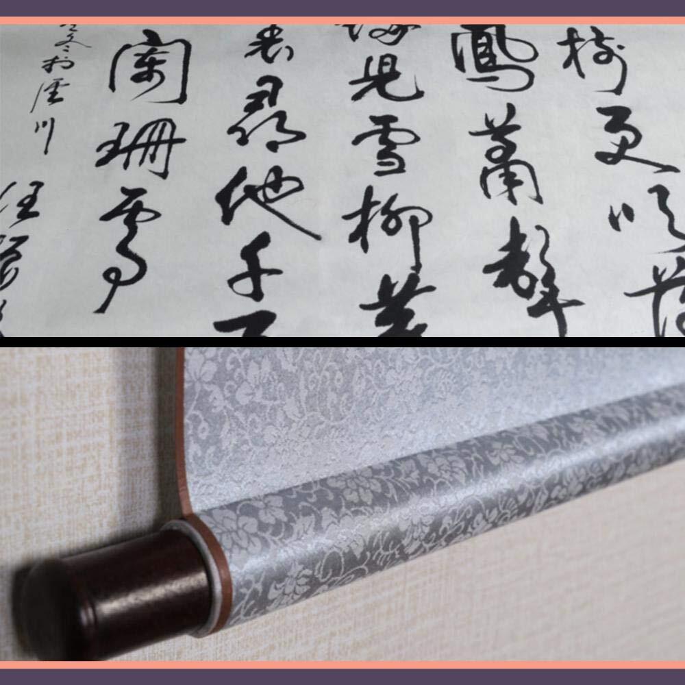 モダンで格調高い和紙緞子の風合いが美しい掛け軸です。巻き軸は木製で高級感があります。