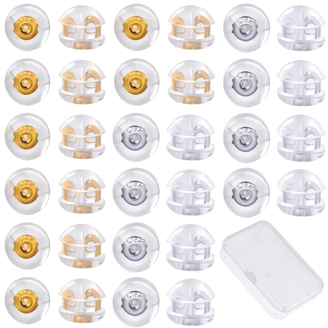 [huazontom] ピアス キャッチ シリコン 落ちない 【約0.65mm - 0.7mmポスト対応 32個入り】 K18メッキ 金属アレルギー 対応 レディース メンズ 透明収納ボックス付き イエローゴールド+ホワイトゴールド