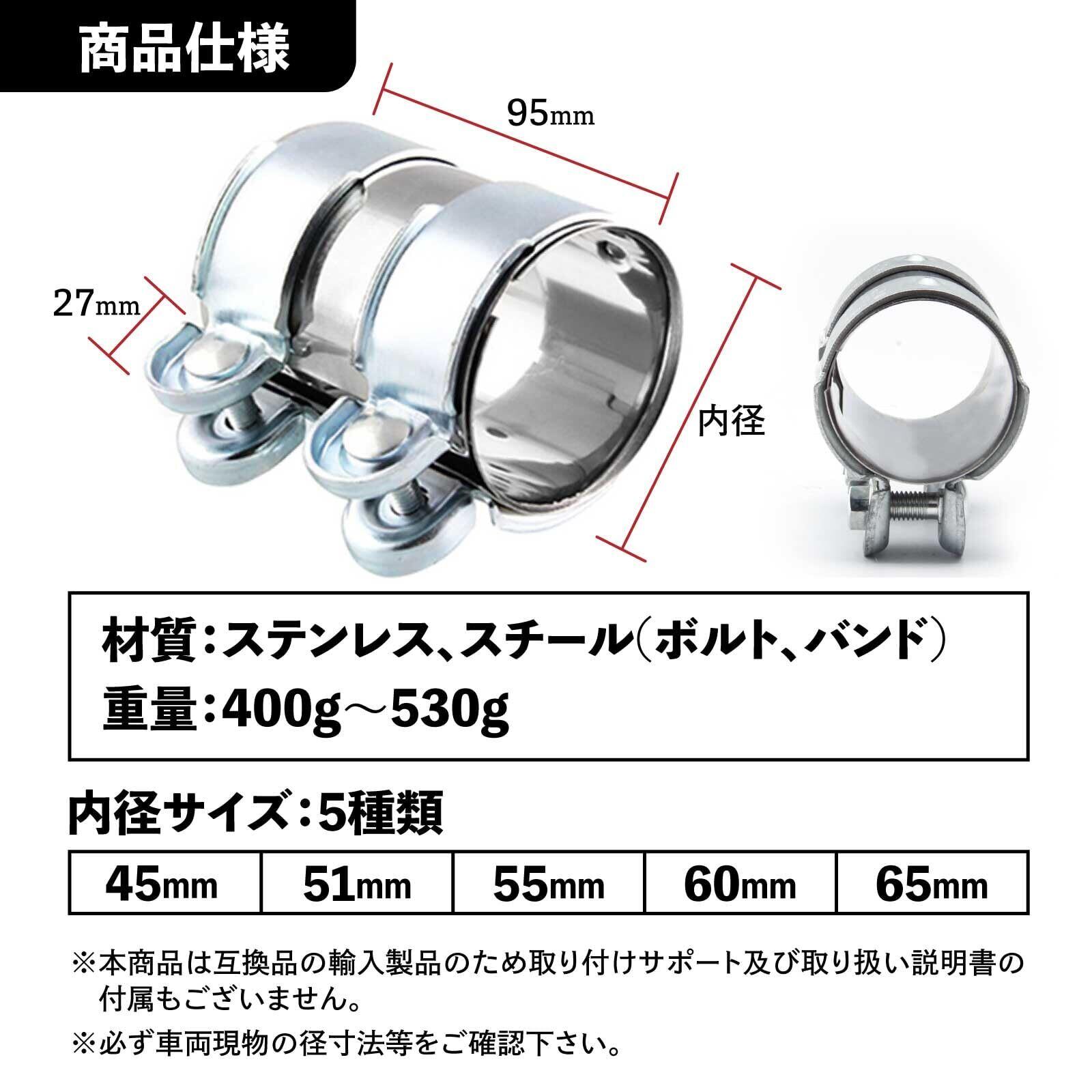 【商品仕様】内径サイズ:45/51/55/60/65mm(数値より約2mmほど閉めることもできます)全長:95mm、材質:ステンレス(付属部材は鉄)、重量:約460g