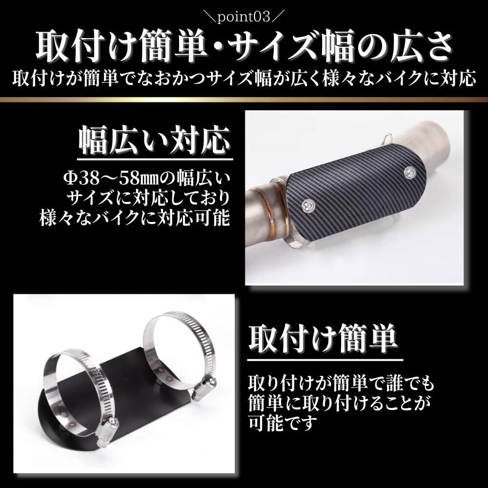 【仕様】対応サイズ:Φ38~58mm / バリエーション:カーボン調、チタン調、ステンレス調 / セット内容:本体×1、固定バンド(装着バンド)一式 ※排気管の大きさに合わせてクランプの直径を調整することができます。