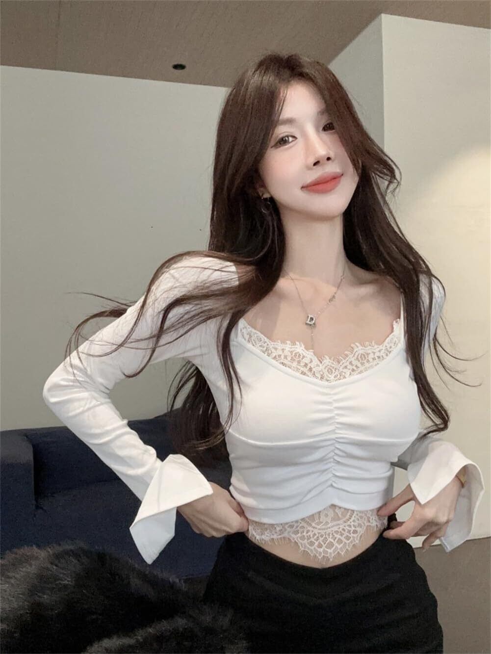 【2022最新】[YONGO] ショート丈 Tシャツ レディース 長袖 スリム インナー レースデザイン トップス 薄手 上着 着痩せ 無地 シンプル 胸元 セクシー おしゃれ きれいめ tシャツ | Premium Stage