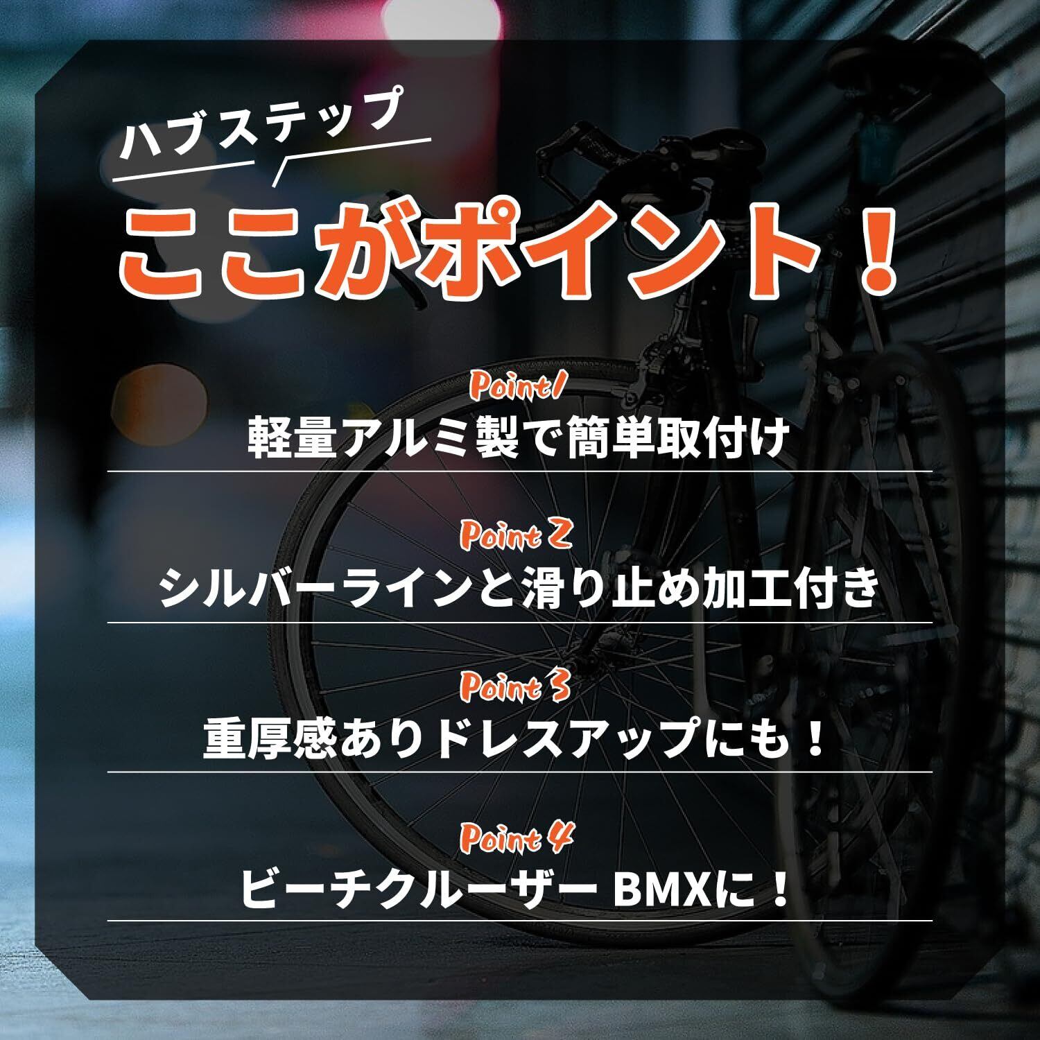 この自転車ハブステップは、4本セットとなっています。bmxペグ、自転車 ステップ、ギヤガードにもお使いいただけ、自転車の変速機(ディレーラー)部分の保護にも役立つカスタムパーツです
