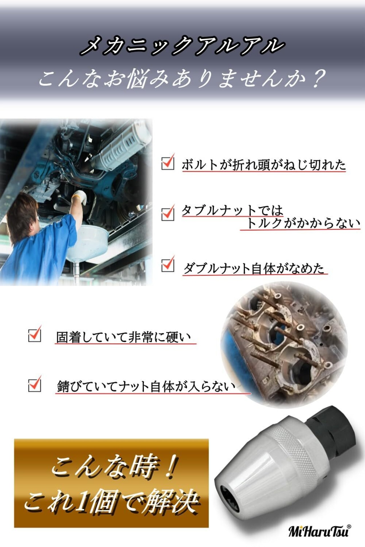 【ツールの詳細】 このスタッドボルトプーラーは、3/8インチドライブを持ち、1/4インチから1/2インチ(6mmから12mm)のほとんどのドライブツールに適合します。手動または空気圧のインパクトレンチ、ラチェット、モンキーレンチ、フラットレンチなど、さまざまな工具で使用できます。高品質の合金鋼を熱処理して製造しており、最大の耐久性を備えています。さらに、クロム仕上げにより防錆対策も施されています。 【使用方法】 スタッドボルトプーラーを対象のスタッドに置き、下部の六角フラットナットを反時計回りに回してジョーを締めます。ジョーが壊れたボルトやスタッドをしっかりと保持したら、スタッドが外れるまで反時計回りに回転させ続けます。スタッドが外れたら、スタッドボルトプーラーを解放して時計回りに離します。 【製品紹介】 このスタッドボルトプーラーは非常に簡単に操作できます。壊れたエキゾーストマニホールド、オイルフィラープラグ、丸みを帯びたスターターボルト、塩水に残った低品位ボルト、塗装済みボルト、錆びたタイトボルトなど、さまざまなボルトに対応します。取り外しにくいボルトやスタッドを効率的に取り除くために設計されています。 【製品のアップグレード】 従来のボルトエクストラクタはサイズが制限されており、エクストラクタの種類が多すぎる場合、スペースとコストの無駄が発生していました。そこで、損傷したスタッドを簡単にクランプして剥がすことができる自動調整可能なスタッドボルトプーラーを開発しました。これにより、さまざまなサイズのボルトに対応できるだけでなく、効率的な作業が可能となりました。 以上のように、このスタッドボルトプーラーは高品質で耐久性があり、多くのボルトに対応する優れたツールです。自動調整機能により、作業の効率も向上し、プロのメカニックやDIY愛好家にとって頼りになる製品となっています。