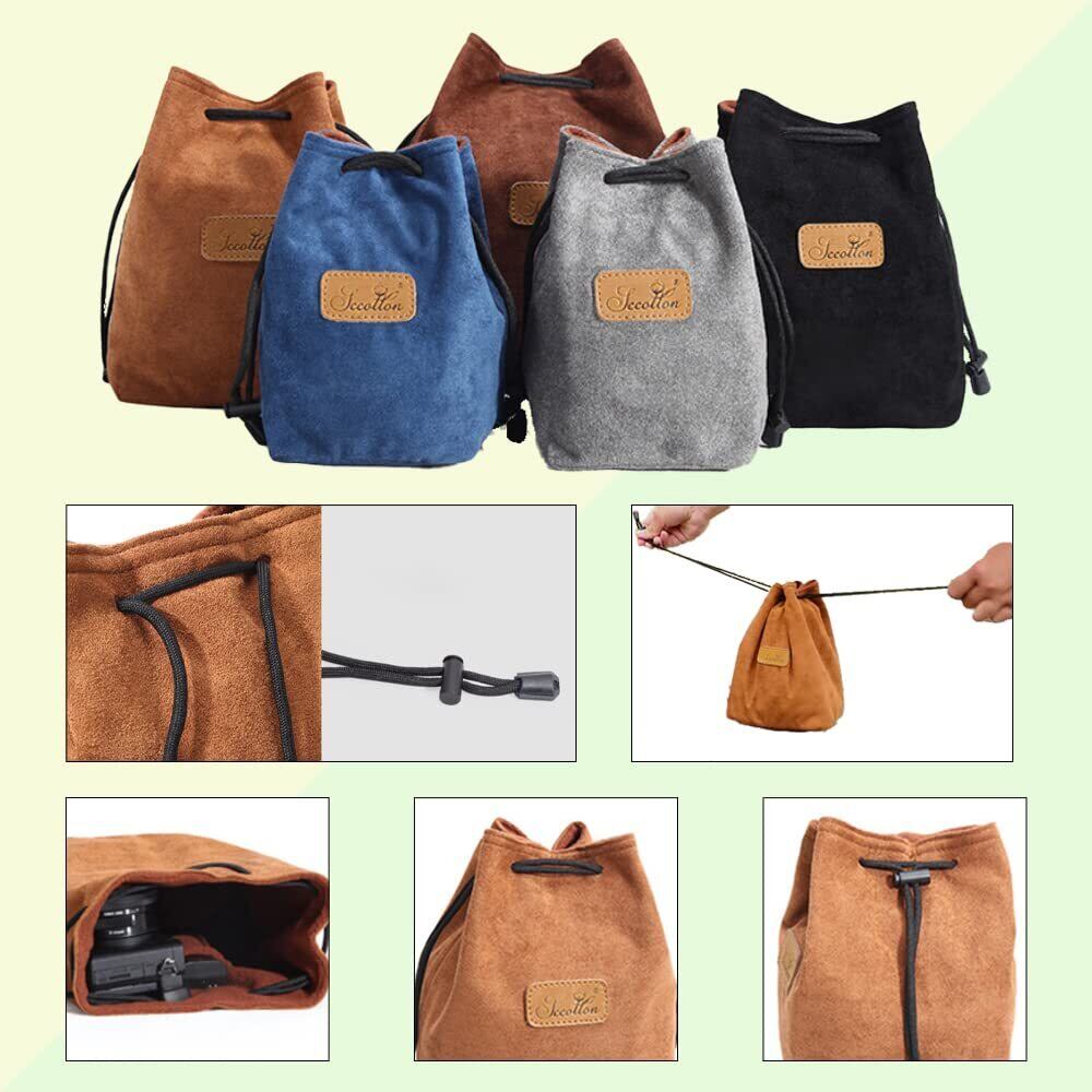 このカメラケースは、開閉がスムーズな巾着式デザインを採用。ストラップを引くだけでしっかり閉まり、持ち運びの際も中身が飛び出しにくい設計です。カラーはブルーやカーキ、ブラウンなど落ち着いたトーンで、カメラバッグの中でも馴染みやすく、シンプルながらもおしゃれな印象を与えます。